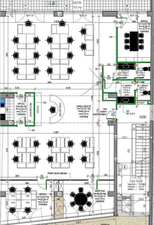 Spațiu de birouri Floreasca a. suprafata utila: 207 mp b. spatii comune si conexe: 44 mp c. total suprafata inchiriabila: 251 mp (conform schita atasata) - incalzire centrala a imobilului; - sistem de climatizare; - paza; - sistem de supraveghere video si de alarma centralizat al imobilului; - sistem de control acces cu carduri magnetice; - finisaje de calitate superioara; - pardoseala acoperita cu mocheta rezistenta la trafic; - 10 ani de la predarea spatiului; - 15 euro/mp, plus TVA pentru spatiul reprezentand suprafata utila; - 7.5 euro/mp, plus TVA pentru celelalte spatii; - total chirie lunara: 3435 euro/luna plus TVA pentru primul an; - taxa pentru servicii: 2,5 euro/mp inchiriabil/luna, adica 630 euro/luna plus TVA; aceast cost include asigurarea imobilului, impozitul pe proprietate, paza si mentenanta aer conditionat; - costurile utilitatiilor se achita suplimentar fata de chiria lunara