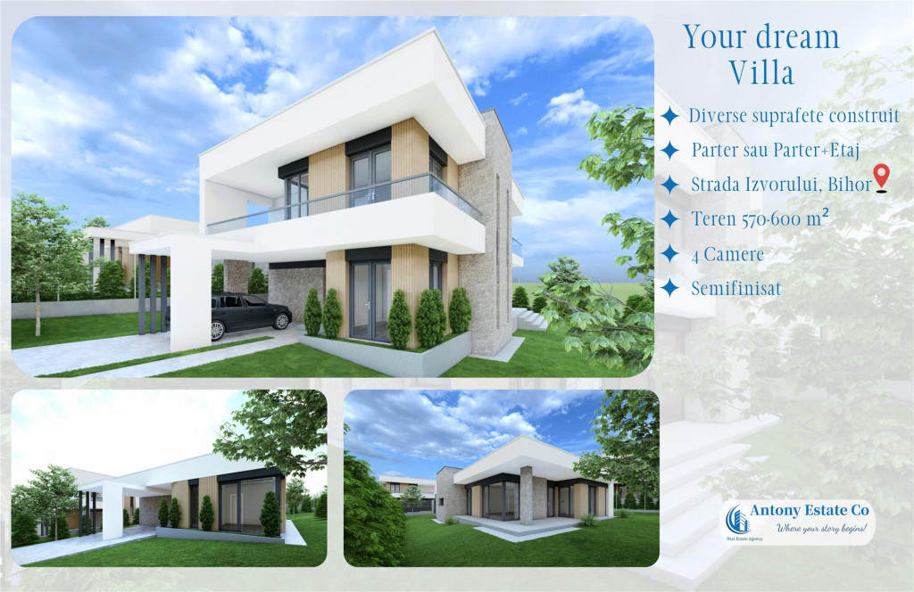 COD: CI SpringHill - case de vanzare P M, Oradea - Bihor Va propunem spre vanzare multiple case, P M sau P, independente, aflate la doar 5 KM de Centrul orasului Oradea - Bihor. Numele acestor proprietati este: Casa del Sole, quot;Villa Di Lucequot; si quot;Villa del Limonequot;. Preturile incep de la: 240.000 euro TVA(21%) pentru Casa del Sole (Plan Parter) ; 255.000 euro TVA(21%) pentru Villa del Limone (Plan Parter); 335.000 euro TVA(21%) pentru quot;Villa Di Lucequot; (Parter Etaj). Casele au o suprafata construita incepand de la 200 msup2;, iar suprafata utila este de 145 msup2;. Imobilele sunt construite pe un teren in suprafata de 570-600 msup2;, dispunand astfel si de o curte si gradina generoasa. Casele quot;Villa del Limonequot; si Casa del Sole sunt dispuse pe un singur nivel. quot;Villa Di Lucequot; este dispusa pe 2 nivele, Parter Etaj. Constructie din caramida si izolata exterior complet - polistiren de 30 cm grosime, semifinisate la interior, finisate la exterior. Acoperis tip planseu ceramic Utilitati: apa, canalizare, gaz, curent monofazic, incalzire in pardoseala. Se accepta toate modalitatile de plata (integral sau credit). Imobilul este liber de orice sarcini. Termenul de predare al imobilelor este de aproximativ 12 luni din momentul achitarii avansului. Oferim clientilor nostri urmatoarele servicii: - Consultanta financiara si juridica; - Consultanta si asistenta in obtinerea creditelor ipotecar-imobiliare; - Echipa de meseriasi (zugrav, instalator, electrician), totul sub contract legal si la termen. - Design interior, asigurari si evaluari proprietati. Antony Estate CO - Where your story begins!