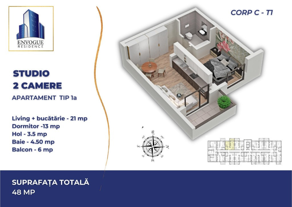 Îți dorești să ai parte de intimitatea și funcționalitatea pe care ți le-ar oferi un apartament cu două camere, dar ești oarecum constrâns la capitolul buget? În ansamblul EnVogue Residence - Iuliu Maniu, din vestul Capitalei, găsești soluția optimă! Este vorba despre un apartament de tip studio, care, deși compartimentat în două camere, este mai compact decât unitățile bicamerale standard din cadrul proiectului nostru – și, deci, mai accesibil ca preț. Spre exemplu, proprietatea pe care ți-o propunem spre vânzare are o suprafață utilă de 48 metri pătrați. Unul dintre atuurile acestui apartament este dat de compartimentarea sa inteligentă: suntem siguri că te vei bucura pe deplin de livingul spațios, cu bucătărie deschisă, dar și de dormitorul intim, practic și funcțional. Programând o vizionare, vei descoperi că proprietatea se remarcă, bineînțeles, prin caracteristicile devenite deja obișnuință pentru clienții noștri, anume calitatea și siguranța construcției, în combinație cu finisajele din categoria premium. PLUS-VALOARE: Ne străduim în permanență să punem la dispoziția clienților noștri cele mai bune oferte financiare, astfel că făcând o achiziție EnVogue Residence - Iuliu Maniu te vei bucura de următoarele beneficii: • Asistență GRATUITĂ, din partea unui broker de credite profesionist, pentru cei interesați de accesarea unei finanțări bancare. • Reducere de 10% la mobila din magazinul Mobexpert Militari, la cumpărarea oricărei locuințe în cadrul EnVogue Residence - Iuliu Maniu. Aflat în dezvoltare pe Bulevardul Iuliu Maniu, nr. 586-590, în imediata apropiere a stației de metrou Preciziei, EnVogue Residence - Iuliu Maniu aduce pe piață apartamente noi de calitate superioară, cu suprafețe și compartimentări variate – garsoniere, studiouri, apartamente cu două și trei camere, dar și penthouse-uri mai spațioase. Recent finalizată, prima fază de dezvoltare a proiectului (corpul C) cuprinde 169 de unități locative, în vreme ce faza a doua (corpul B) este aflată în derulare și cuprinde 214 apartamente. Locuințele din cadrul proiectului au suprafețe generoase, peste media practicată în mod obișnuit pe acest segment de piață, în vreme ce dotările și finisajele se încadrează în categoria premium, tocmai pentru a furniza rezidenților acel plus de confort pe care și-l doresc în propriile case. Dovadă a atenției deosebite acordate siguranței și confortului locatarilor, fiecare bloc din cadrul ansamblului EnVogue Residence - Iuliu Maniu include propriul adăpost de protecție civilă, amplasat la subsolul clădirii. De asemenea, dezvoltatorul a început deja instalarea de panouri fotovoltaice în cadrul proiectului, astfel că viitorii rezidenți se vor putea bucura de confortul și beneficiile unei surse de energie regenerabilă. Specificații și facilități: • Regim de înălțime de 10 etaje • Fundație de tip radier general, cu 2 subsoluri • Structură pe cadre de beton • Adăpost de protecție civilă pentru fiecare bloc • Panouri fotovoltaice • Certificat de performanță energetică de clasa A • Compartimentări interioare din cărămidă Porotherm • Izolație exterioară realizată din vată bazaltică și polistiren • Grad ridicat de protecție ignifugă • Sistem de termoizolație și hidroizolație de la Sika pentru terase • Spații verzi și zonă de promenadă • Locuri de joacă pentru copii • Spații comerciale, restaurant, sală de fitness, supermarket • Stații de încărcare pentru mașini electrice etc. Despre EnVogue Residence Cu o experiență de circa 9 ani pe piața rezidențială din Capitală și împrejurimi, portofoliul dezvoltatorului autohton EnVogue Residence cuprinde 5 proiecte finalizate și unul aflat în curs de construcție, anume EnVogue Residence - Iuliu Maniu. Printre obiectivele avute în vedere de companie se numără, în primul rând, siguranța și confortul locatarilor, alături de accesul facil la mijloacele de transport în comun, inclusiv metrou, respectiv către principalele puncte de interes ale orașului. Hai la vizionare !!!!