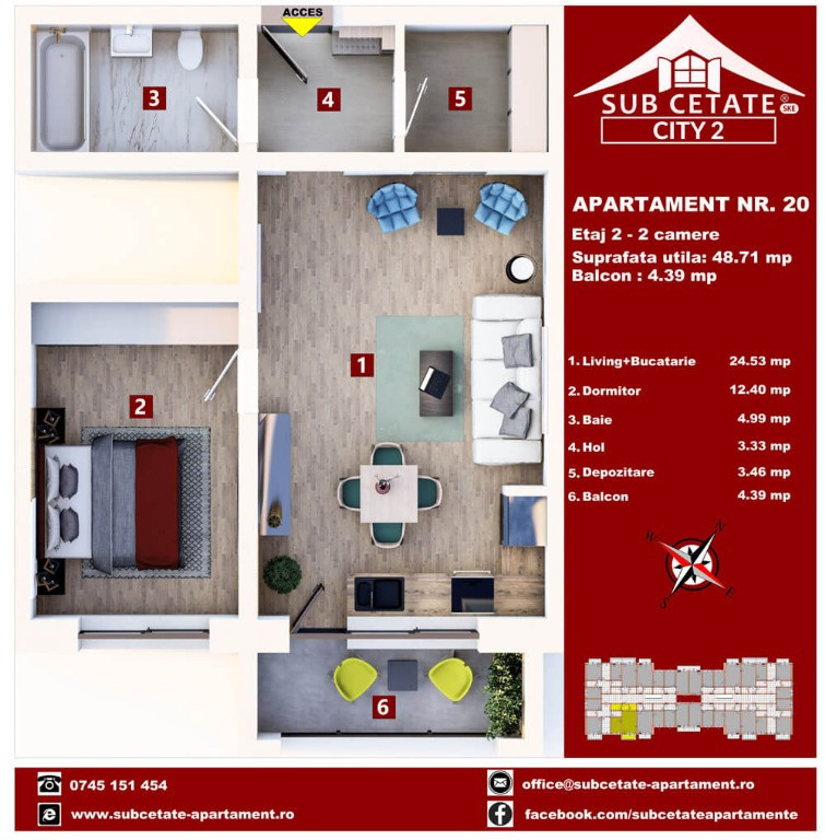 Ocazia unică de a deveni proprietar! Studio cu suprafață generoasă, pus în vânzare de către Subcetate Apartamente, Dezvoltator Imobiliar (fără comision) Suprafață generoasă: 49 mp utili, oferind un confort și un spațiu optim pentru întreaga familie. Balcon privat: Ideal pentru momente de relaxare și pentru a beneficia de aer proaspăt. Încălzire eficientă în pardoseală: pentru un confort termic deosebit în orice moment al anului. Centrală proprie pe gaz: asigurând economie și control complet al temperaturii în fiecare încăpere. Finisaje personalizabile: gresie, faianță, parchet și uși de interior, la alegerea ta pentru a-ți personaliza spațiul. Siguranță sporită: cu ușa metalică la intrare și sistem de interfon pentru securitate și acces. Interior spațios și luminozitate optimă: Design modern și funcțional, cu spații bine delimitate. Zona de living open-space spațioasă, oferă un mediu confortabil și primitor pentru momentele de relaxare și socializare în Studio-ull nostru Dormitor confortabil: Cu un dormitor intim și primitor, perfect pentru odihnă și relaxare. Spațiu generos pentru mobilier și depozitare, pentru a-ți organiza lucrurile în mod eficient. Baie complet utilată și amenajată: Cu obiecte sanitare standard și utilități de calitate, pentru confortul și practicitatea zilnică. Bucătărie : Open-space este practică si ideală pentru prepararea și servirea meselor într-un mediu separat. Spatiu de depozitare / dressing elegant și funcțional: Spațiu generos pentru organizarea și păstrarea hainelor, încălțămintei și a altor accesorii. Situat într-o zonă liniștită și accesibilă, cu ușor acces către mijloacele de transport în comun și principalele atracții ale orașului. Beneficiind de un complex rezidențial complet, Subcetate City 2, cu o gamă variată de facilități: magazine, loc de joacă pentru copii, cabinet medical de familie, farmacie, carmangerie cu produse din ferma proprie, centru de fitness, frizerie și bancomat. Toate utilitățile, inclusiv apa, gazul și curentul electric, sunt contorizate individual. Pentru mai multe informații și pentru a programa o vizionare, sunați acum la numărul afișat! Telefon: 0747 111 900 - Cioacă Ion