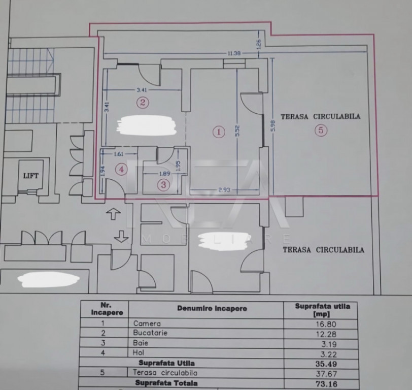 • Suprafață totală: 73,16 mp, Suprafață utilă 35,49 mp, terasă 37,67 mp