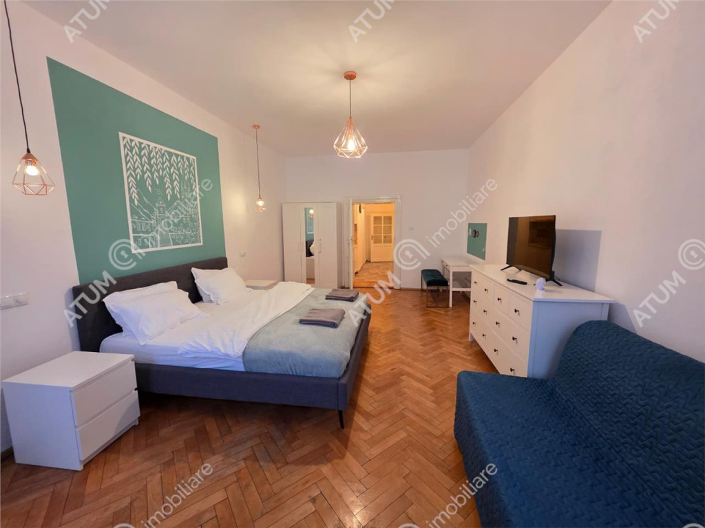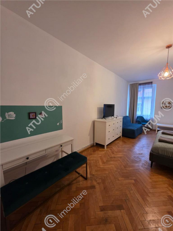 Va oferim spre inchiriere un studio la casa, foarte spatios si bine compartimentat, avand o suprafata totala de 53 mp, in cea mai frumoasa zona din orasul Sibiu, Centrul Istoric. Suprafata utila a acestui studio este de 44 mp, fiind compartimentat astfel: camera de zi de 11,5 mp, dormitor de 27 mp, bucatarie deschisa de 2.2 mp, si baie de 3 mp. Pentru finisarea la cheie s-au folosit materiale precum: parchet laminat, gresie si faianta in bucatarie si baie, pereti zugraviti in lavabila de culoare alba, usi interioare din lemn, centrala termica proprie pe gaz si calorifere, termostat digital, tamplarie dubla de lemn cu geamuri pentru o mai buna izolare termina si fonica, baie dotata cu obiecte sanitare, cabina de dus walk-in si geam de aerisire. Locuinta se preda complet mobilata si utilata cu mobilier de bucatarie realizat pe comanda din MDF cu electrocasnice incastrate (plita pe curent, hota), masina de spalat rufe, comoda, televizor, masuta de cafea, canapea, fotolii, mobilier de dormitor. In imediata apropiere regasim numeroase magazine alimentare, piata, statie de transport in comun, statie taxi, restaurante, teatru, farmacii, scoala, gradinita, centru universitar. Studioul este pretabil pentru subinchiriere in regim hotelier. Valoarea de imchiriere este 450 Euro / luna garantie. ID intern: 3130.