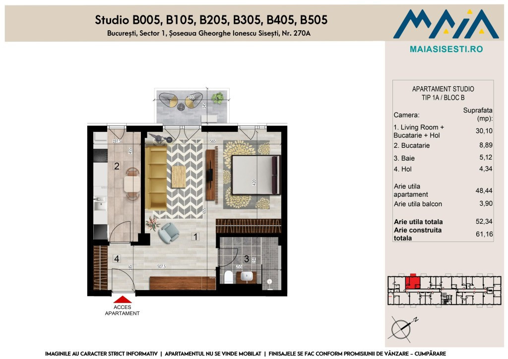 Preturile afisate sunt fara TVA si cu predare la stadiul semifinisat | Costul finisajelor este de 150 EUR fara TVA pe mp construit. Avem plăcerea să vă prezentăm oportunitatea de a achiziționa un apartament în proiectul rezidențial Maia Sisesti, faza a 2-a, situat pe Soseaua Gheorghe Ionescu Sisesti, la doar 350 de metri de Stația de metrou Straulesti. În cadrul ansamblului rezidențial Maia Sisesti, vă oferim un mix variat de apartamente cu 1, 2, 3 și 4 camere, fiecare cu avantajele lor specifice. Astfel, putem răspunde nevoilor și preferințelor tuturor clienților noștri. Indiferent dacă căutați un spațiu confortabil pentru un singur locuitor sau o locuință mai generoasă pentru o familie, veți găsi aici soluția ideală pentru dumneavoastră. Fiecare tip de apartament este proiectat cu atenție la detalii și finisaje de calitate superioară, oferindu-vă confort și bunăstare în noua voastră casă. Dotari ansamblu: - Ansamblul rezidențial va beneficia de ascensoare Schindler în fiecare corp de clădire, pentru acces facil. - Spațiile verzi amenajate vor oferi un mediu plăcut și relaxant în jurul blocurilor. - Casa scării și spațiile comune vor fi finisate modern, oferind un aspect primitor și estetic plăcut. Finisaje fixe: - Finisajele interioare vor asigura confort termic și acustic, permițându-vă să vă bucurați de intimitate și liniște. - Centrala termică și instalație termică pentru confort termic și apă caldă. - Ușa de intrare va fi din metal, imbracată în MDF, asigurând siguranță și izolare termică. - Tamplaria PVC cu geam termopan va asigura izolare termică și fonică eficientă. - Obiecte sanitare de calitate superioară pentru băi elegante și funcționale. - Gletul și șapele aplicate vor pregăti apartamentul pentru finisaje suplimentare. - Conexiunea pentru telefonie, internet și cablu TV va asigura conectivitatea dorită. - Instalația electrică. Finisaje la alegere (diverse modele): Pentru a vă personaliza apartamentul după preferințele dumneavoastră, puteți opta pentru finisaje opționale, cum ar fi: - Parchet laminat din aproximativ 10 modele disponibile. - Gresie și faianță în 3 variante, pentru un aspect modern și rafinat. - Uși interioare, cu diverse modele și culori, pentru a completa designul interior. Bransamente: Blocurile vor fi bransate la energie electrică, gaze naturale, apă și canalizare, oferind toate utilitățile necesare pentru a satisface nevoile rezidenților. De asemenea, locatarii vor avea acces la servicii de cablu, internet și telefonie, asigurând conectivitate și comunicare fără întreruperi. Parcari: Ansamblul beneficiază de facilități de parcare moderne. Acestea se regasesc la nivelul subsolurilor si demisolurilor celor doua corpuri si sunt contra cost. Preturile si diponibilitatile pot fi accesate oricand pe site-ul proiectului (maiasisesti*ro). Avantaje ale locației: - Acces facil la stația de metrou Straulesti, la doar 350 de metri distanță. - În apropiere se găsesc numeroase școli, grădinițe și unități de învățământ, precum și facilități recreative și de divertisment, cum ar fi Parcul Dendrologic Chitila și Palatul Mogoșoaia. - Enayati Medical City si Spitalul Regina Maria Băneasa asigură servicii de sănătate de calitate. - Diverse opțiuni de shopping în apropiere, inclusiv Băneasa Shopping City și Colosseum Mall. Transport - Statia de metrou Straulesti (350 m); - Statia de autobuz "Bucuresti Targoviste" [205]; - Statia de autobuz "2 Cocosi" [204, 304, 436]; - Aeroportul Aurel Vlaicu; Scoli si gradinite - Scoala/Gradinita Aletheea; - Scoala/Gradinita internationala Matei; - Scoala gimnaziala, Nr. 13; - Scoala gimnaziala, Nr. 6; - Scoala gimnaziala, Nr. 1; Recreere & Entertainment - Parcul Dendrologic Chitila; - Parcul Mogoşoaia; - Palatul Mogoşoaia; - Parcul Bazilescu; - Parcul Regele Mihai I al României. Ingrijire si sanatate - Spitalul Regina Maria Băneasa; - Enayati Medical City; Shopping - Băneasa Shopping City; - Colosseum Mall; - Mega Image Shop & Go; - Kaufland Straulesti, etc. Nu ratați această oportunitate de a vă achiziționa un apartament nou într-o zonă în dezvoltare rapidă, cu acces facil la metrou și numeroase facilități în jur. Pentru mai multe informații și pentru a programa o vizionare, vă rugăm să ne contactați la numărul de telefon 0799008822 sau să vizitați site-ul proiectului pe maiasisesti*ro.