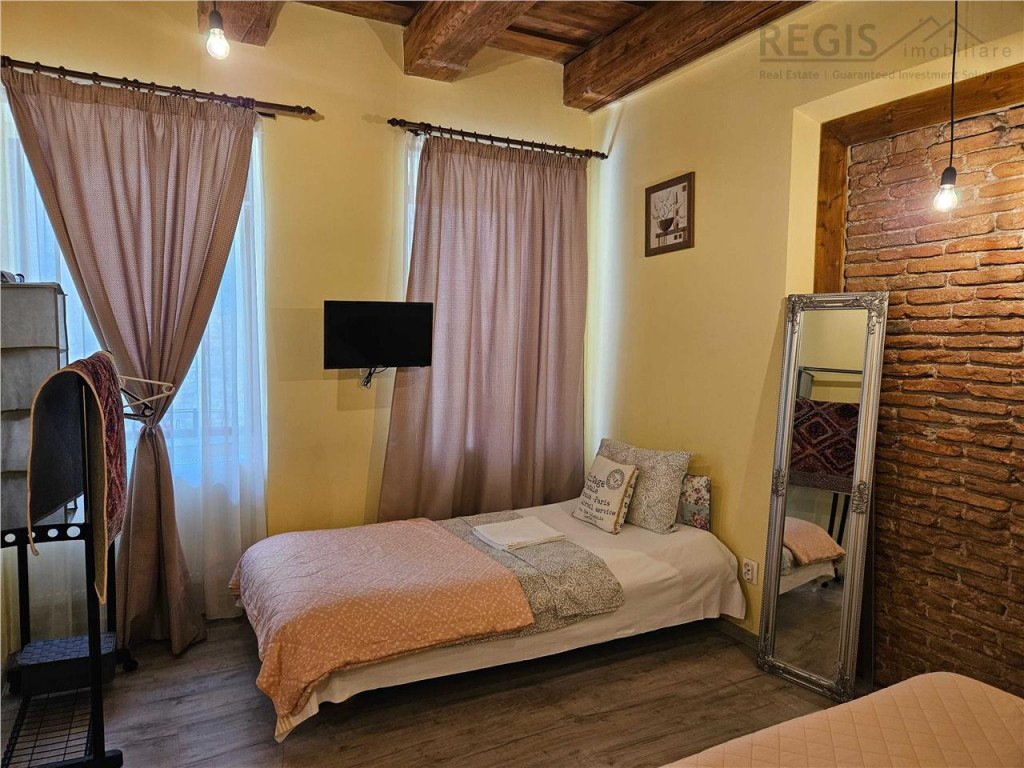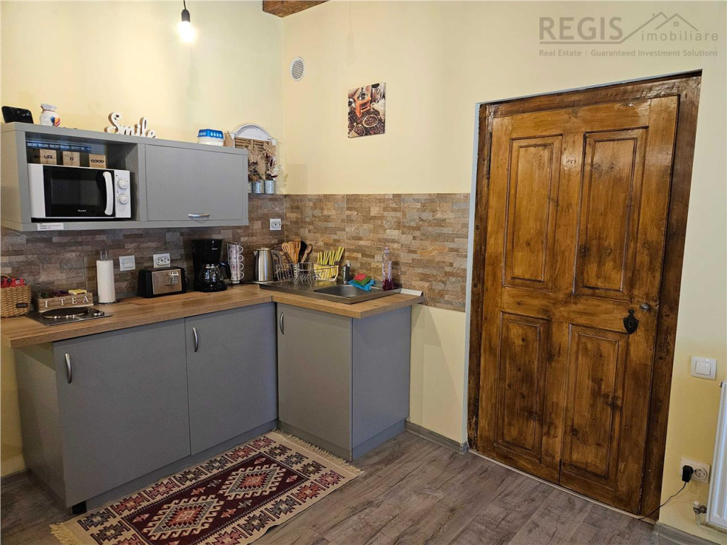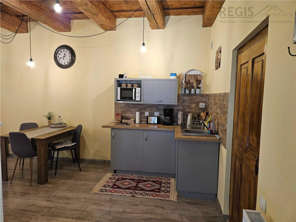 ID intern: 6462 Regis Imobiliare va propune spre vanzare un studio situat in Centrul Istoric al Brasovului, pe strada Michael Weiss, la doar 70 m de Piata Sfatului. Proprietatea este recent renovata complet, atat la interior, cat si la exterior (fatada imobilului), si se vinde mobilata, fiind gata pentru locuit sau exploatare in regim hotelier/Airbnb. Studio-ul este amplasat intr-o constructie solida din caramida, cu barne autentice din lemn masiv, care pastreaza farmecul specific zonei istorice. Compartimentare: - camera - bucatarie - baie - hol - debara / spatiu de depozitare (aprox. 5 mp) - pivnita pentru depozitare - acces la mansarda comuna (spatiu de depozitare) Alte avantaje: - centrala termica proprie pe gaz - contor individual de apa - iesire directa din proprietate in curtea interioara - proprietate pretabila atat pentru locuinta, cat si pentru investitie (Airbnb) Comision agentie: 2% TVA.