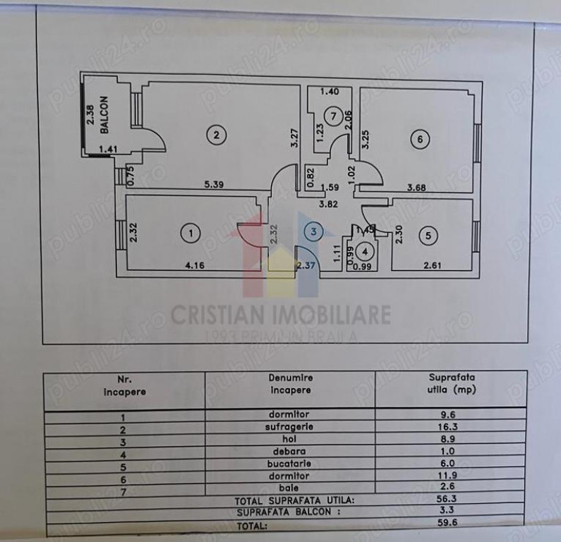 SUPER PRET Apartament 3 camere, confort 1, decomandat, suprafata utila 60 mp, etaj 3 - centrala termica proprie; - termopan PVC (inclusiv in balcon); - parchet lemn natural, faianta, gresie; - usi interioare din lemn; - usa intrare din metal; - interfon; - casa scarii este iluminata natural; - izolat termic; - vedere atat in fata blocului cat si in curtea interioara; - nelocuit, se poate preda oricand. Cristian Imobiliare - din 1993 Primii in Braila CRS6668 amp;11