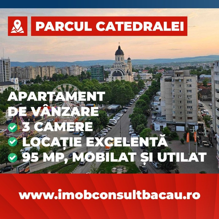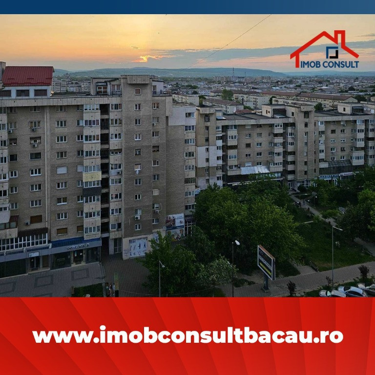 Te poti muta imediat! Imob Consult Bacau va prezinta un apartament care imbina confortul, intimitatea si o priveliste deosebita! Printre avantajele acestei proprietati se numara camerele spatioase complet mobilate, 2 bai complet utilate, 2 balcoane inchise, lumina naturala din abundenta si priveliste panoramica asupra Parcului Catedralei. Daca consideri ca proprietatea iti este potrivita si vrei sa afli mai multe detalii, programam o vizionare. Ne puteti contacta la numerele de telefon 0740^288^297 Corina, 0745^912^616 Vlad si/sau ne gasiti la sediul agentiei noastre, IMOB CONSULT Bacau situat pe strada Banca Națională, nr. 27, la intersecția cu Neagoe Vodă, lângă Irish Pub.