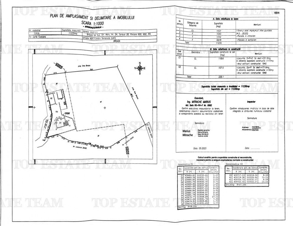 Excelenta prin experienta ! Va propunem spre vinzare in exclusivitate un teren de 11230 m.p. care se afla in Breaza de Sus mai exact pe strada Morii . Terenul este parcelat in 4 loturi astfel : 3 parcele intravilan cu o suprafata de 4252 de m.p. si o parcela extravilan cu o suprafata de 6978 m.p. Terenul are o deschidere de 85 m.p. si dispune de 2 constructii care au fost facute in perioada interbelica in anul 1940 , in stadiul actual pot fi demolabile . Prima constructie C1 a fost o vila construita pe un regim de inaltime S P E cu suprafata construita la sol de 119 m.p. si suprafata desfasurata de 332 m.p. A doua constructie C2 a fost o casa construita pe un regim de inaltime Dp P cu suprafata construita la sol de 108 si suprafata desfasurata de 172 m.p. Strada Morii care duce la teren este asfaltata iar utilitatile , apa,gaz, electricitate , canalizare pot fi trase din apropierea strazii . Zona verde cu vegetatie , fara trafic , pretabil pentru o vila de lux sau pentru dezvoltarea unui complex premium ! Pentru alte detalii si vizionare ne puteti contacta !