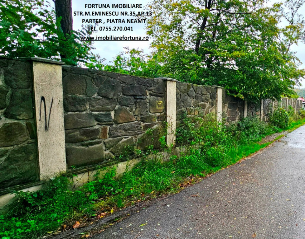 TEREN 1.250 MP, ZONA STADION, PRIVELIȘTE ȘI CADRU NATURAL SUPERB, 80 EURO/ MP Celor aflați în căutarea unui teren pentru construcție sau pentru investiție imobiliară, FORTUNA IMOBILIARE le oferă posibilitatea de a cunoaște beneficiile acestui teren situat în intravilanul municipiului Piatra Neamț, cu pădurea în spate, într-o zonă rezidențială în plin avânt imobiliar. Terenul este drept, împrejmuit, cu intrare din drum asfaltat. Toate utilitățile - electricitate, gaz, apă și canalizare sunt în fața terenului. Are toate actele la zi, liber de sarcini. Preț 80 euro / mp Pentru o prezentare detaliată a acestei oferte, furnizarea unor informații suplimentare referitoare la situația juridică / identificarea imobilului și programarea unei vizionări, vă invităm la sediul nostru, Fortuna Imobiliare, situat pe str. M. Eminescu, nr. 35, ap. 13, parter, lângă fostul Tribunal, tel. contact 0755.270.041. Your comfort is our priority ! Oferta noastră completă o găsiți aici: https://imobiliarefortuna.ro/