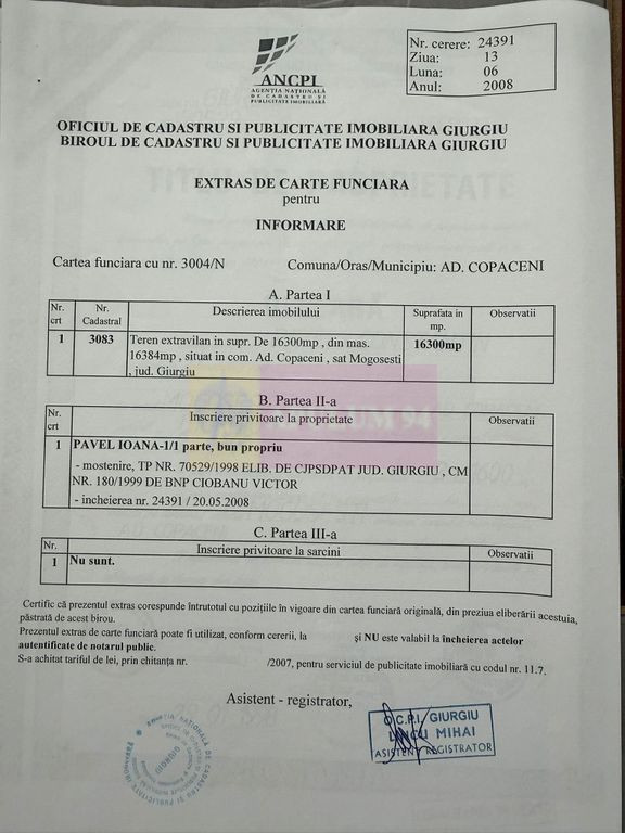 Teren cu suprafață de 16.300 mp situat în Mogoșești, comuna Adunații Copăceni, la distanță redusă de București, aprox 14 km. Proprietatea este potrivită pentru investitori care urmăresc dezvoltări rezidențiale în etape sau parcelare. Actele sunt complete, terenul este intabulat și liber de sarcini. Accesul se face din drum de exploatare. Date principale: Suprafață: 16.300 mp (16.384 mp din măsurători) Nr. cadastral: 3083 Carte funciară: liberă de sarcini Regim: extravilan Categoria: arabil Deschidere: aproximativ 29–30 m la drum de exploatare Lungime teren: aproximativ 250 m Caracteristici: teren compact, ușor de organizat în loturi acces existent, fără servituți complicate zonă liniștită, fără construcții industriale potrivit pentru proiecte rezidențiale pe termen mediu Utilități: nu sunt disponibile pe teren posibil existente în zonă (neconfirmate la limită) Vecinătăți: terenuri libere și proprietăți individuale acces din drum de exploatare zonă în curs de dezvoltare Utilizare recomandată: parcelare în loturi de 400–600 mp dezvoltare rezidențială etapizată investiție pe termen mediu Preț: 11 €/mp Total 179.300 €