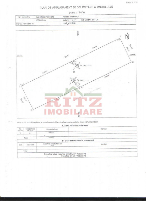De vanzare teren extravilan ndash; 16,5 ha, com. Cilieni Agentia RITZ IMOBILIARE ofera spre vanzare un teren extravilan in suprafata de 16,5 hectare, situat in comuna Cilieni, Judetul Olt. Teren compact, ideal pentru exploatare agricola eficienta, Acces excelent ndash; deschidere la 3 drumuri de exploatare acces din drum comunal, Cadastru separat, Toate actele la zi, Potrivit pentru agricultura, Teren cu potential agricol bun, cunoscut in zona pentru fertilitate, Pret: 10.000 euro/ha * pentru mai multe detalii si programare vizionari va rugam sa contactati Consultantul agentiei Ritz Imobiliare la 0745.45.00.48 sau la biroul agentiei din Slatina, Bld.A.I.Cuza, Bl.V31, Sc.A,Et.1,Ap.3 ( la Valcea). E-mail: [email protected] / Site: www.ritzimobiliare.ro