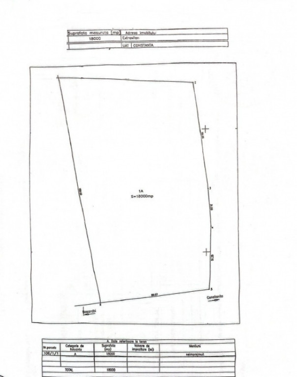 Agenția Experți Imobiliari vă propune spre achiziție un teren în suprafață de 18.000 mp, cu formă dreptunghiulară, situat strategic la DN, în zona Stația Meteo, pe direcția Valu lui Traian. Terenul beneficiază de o poziționare foarte bună, cu acces facil direct din drumul național, fiind potrivit pentru dezvoltări industriale sau logistice. Datorită amplasării și suprafeței generoase, proprietatea se pretează pentru construcția de hale, depozite sau alte activități comerciale. Utilitățile se află în zonă, ceea ce reprezintă un avantaj important pentru viitoarele proiecte de dezvoltare. Terenul este încadrat ca extravilan construibil, oferind flexibilitate în utilizare. Proprietatea dispune de cadastru și intabulare, fiind pregătită pentru vânzare imediată. Dacă sunteți în căutarea unui teren mare, bine poziționat, cu potențial investițional ridicat în apropiere de Constanța, această ofertă merită analizată. E.3(P33260) Id intern: P33260