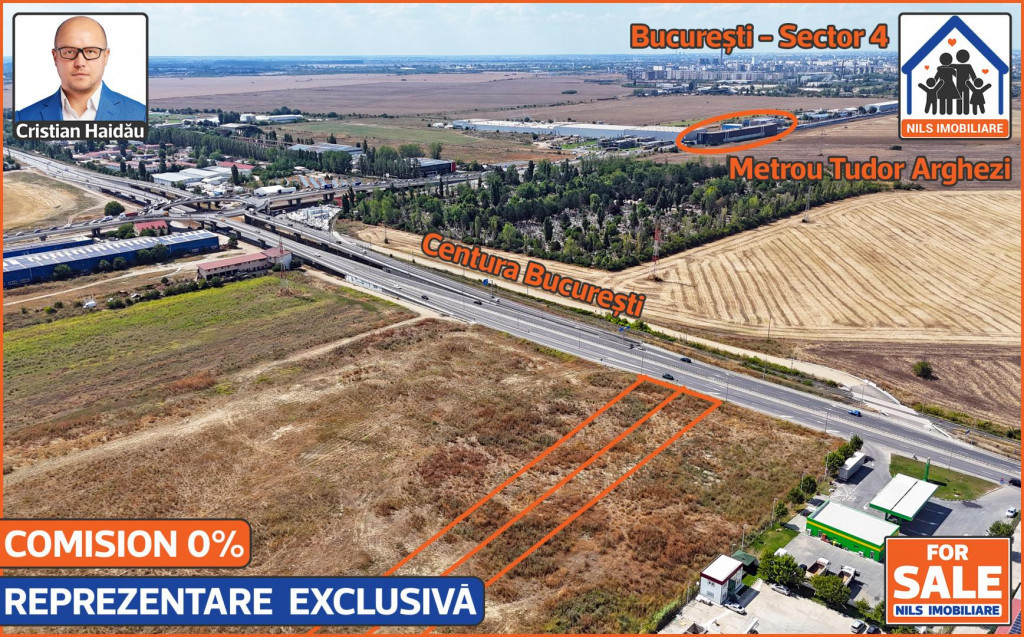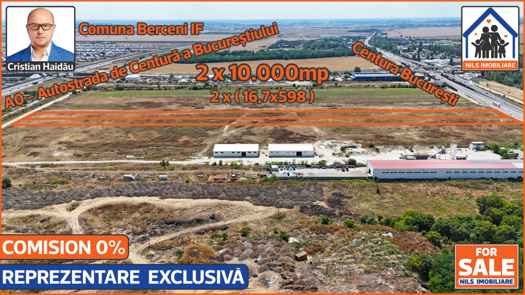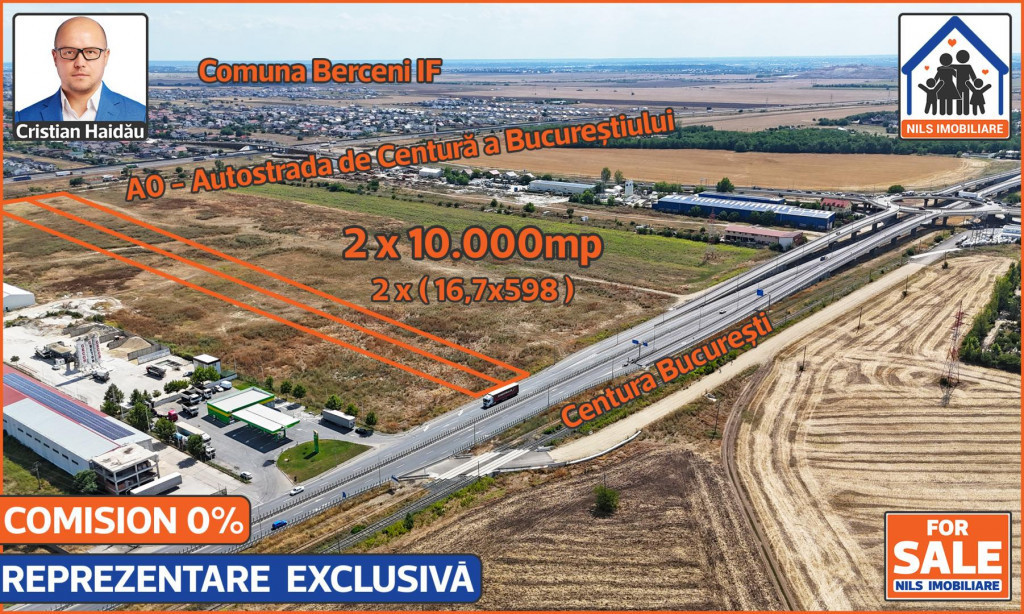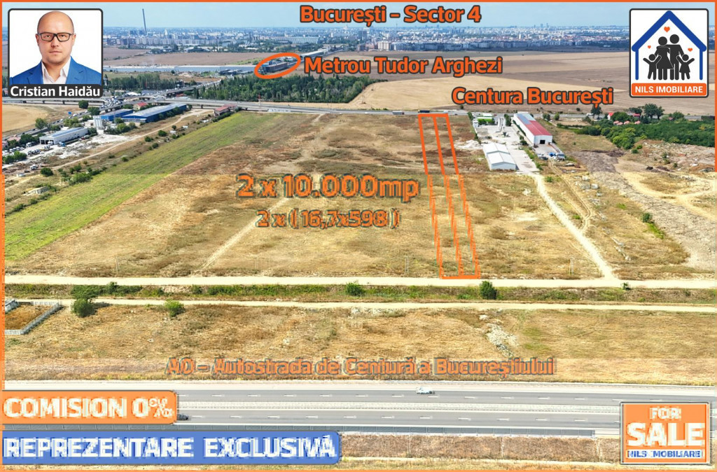 De vanzare doua terenuri intravilane alaturate, extraordinar de bine pozitionate, situate intre Centura Bucurestiului si A0 - Autostrada de Centura a Bucurestiului. / Fiecare teren are o suprafata de 10.000 mp si deschidere la Centura Bucurestiului de 16,2 ml, respectiv 16,9 ml. / Laturile dinspre A0 au deschidere la un drum paralel cu autostrada, ce duce spre nodul rutier dintre A0 si Bulevardul 1 Mai din Berceni. / In proximitatea terenurilor se afla retele de curent, gaze si canalizare. / Statia de metrou Tudor Arghezi, cu Park