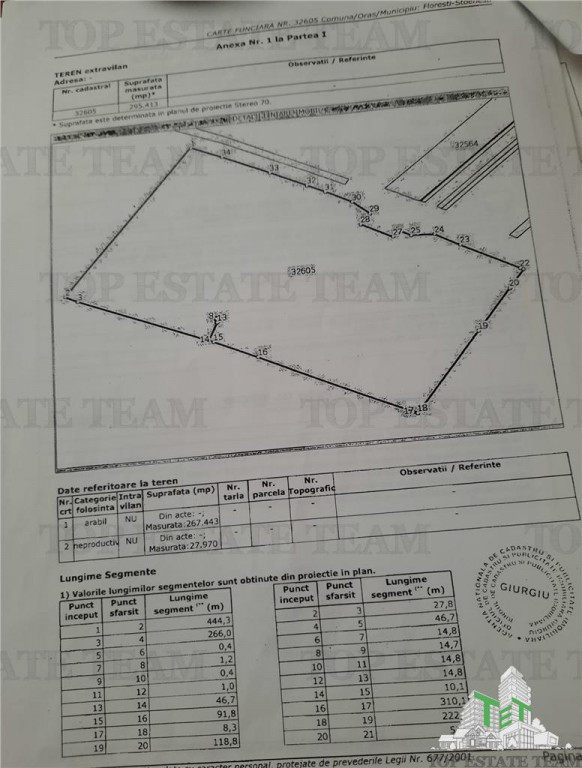 Excelenta prin experienta! Va prezentam o oportunitate remarcabila de investitie ndash; un teren situat strategic pe Autostrada A1, sens Pitesti ndash; Bucuresti, la km 34, in zona Bolintin Vale, la doar 2-3 km de Corsarul Rosu, in imediata apropiere a viitorului nod rutier cu Autostrada A0. Caracteristici principale: bull; Suprafata totala: 295.000 mp, cu o configuratie avantajoasa pentru dezvoltare. bull; Front stradal impresionant la Autostrada A1: aprox. 500 ml, 800 ml deschidere la drumul de exploatare. bull; Latime: 444 ml in partea stanga si 400 ml in partea dreapta. bull; Acces excelent datorita proximitatii nodului rutier A0, care va asigura legatura directa cu Autostrada Soarelui (Constanta) si noua centura a Capitalei. bull; In mijlocul terenului, la iesirea de pe autostrada, statul roman a achizitionat 5.000 mp pentru CNAIR, la un pret de 22 euro/mp, in vederea construirii viitoarei statii de taxare a Autostrazii A1 ndash; confirmand astfel importanta strategica a amplasamentului. bull; Posibilitati multiple de dezvoltare: platforme logistice, hale industriale, centre de productie, dar si potential pentru activitati conexe (ex. exploatare piscicola), datorita apropierii de raul Arges. bull; Documentatie completa disponibila: certificat de urbanism de informare, cadastru, intabulare si extras de carte funciara ndash; accesibile la initierea negocierilor. Aceasta proprietate reprezinta o oportunitate de investitie rara, ideala pentru dezvoltatori si investitori strategici interesati de extinderea in zona de vest a Capitalei. Terenul se vinde la pretul de 13euro/mp, adica 3835000 euro, la care nu se adauga TVA, discutabil ! Compania noastra ofera asistenta completa in procesul de achizitie, inclusiv consultanta juridica si solutii de finantare avantajoase prin parteneriate bancare de top. Oferta apartine in exclusivitate agentiei TOP ESTATE TEAM !