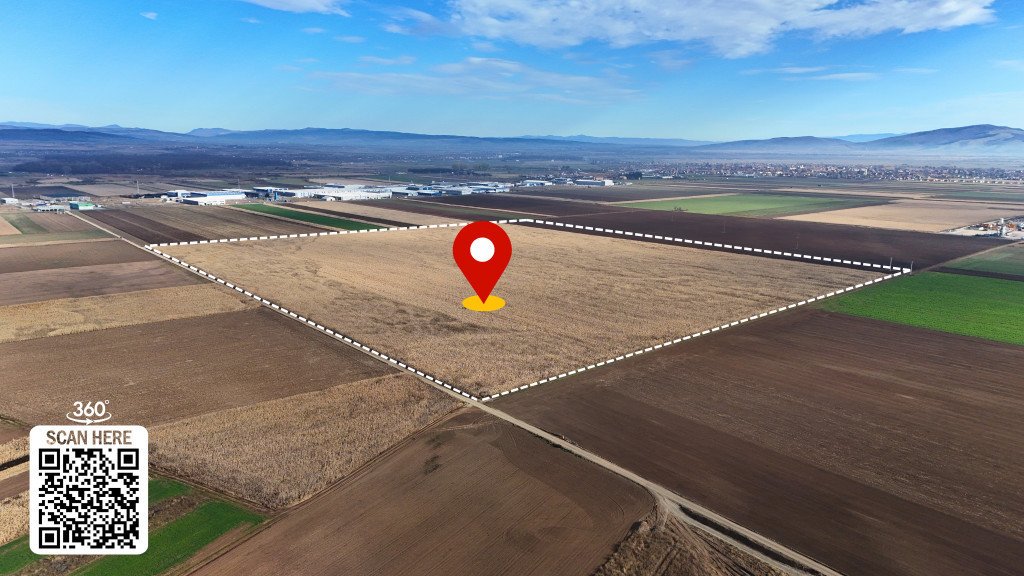 Teren in suprafata de 32.5 Ha compact, pretabil constructii industriale/ rezidentiale sau parc fotovoltaic, la numai 8 km distanta de Brasov. Amplasat la intrarea in localitatea Prejmer, vis a vis de Parcul industrial din localitate, retras cu 500 m(drum acces) fata de DN 10. Intabulat in CF, unic proprietar, actele OK. Terenul este perfect plan si fara constructii. Utilitati in zona. Pentru o mai buna vizualizare si distingerea mai multor detalii recomand parcurgerea turului virtual care poate fii accesat prin codul QR din imaginile anuntului sau direct prin link-ul imaginilor 360 https://virtual.dronedata.io/tours/lDQT8xAR4za Coordonate amplasare teren 45°42'23.9"N 25°44'09.6"E Se vinde doar integral intreaga supratata.