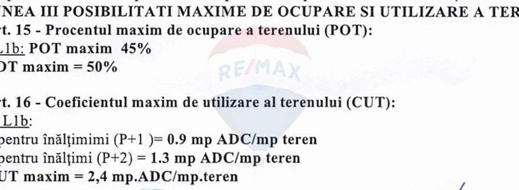 Teren de vânzare cu potențial excelent de dezvoltare – conform PUZ Vă prezentăm un teren ideal pentru investiție, situat într-o zonă reglementată urbanistic, cu următoarele caracteristici: P + 2 Regim constructie Procent maxim de ocupare a terenului (POT): Pentru zona L1a și L1b: 45% Pentru zona T1: 50% Coeficient de utilizare a terenului (CUT): Pentru L1a și L1b: Regim de înălțime P+1: 0,9 mp ADC/mp teren Regim de înălțime P+2: 1,3 mp ADC/mp teren Pentru T1: 2,4 mp ADC/mp teren Aceste reglementări oferă multiple opțiuni de dezvoltare, de la locuințe individuale sau colective joase, până la construcții cu regim mediu de înălțime, în funcție de zona urbanistică. Ideal pentru dezvoltatori sau investitori care caută un teren bine poziționat, cu parametri urbanistici clari și permisivi!