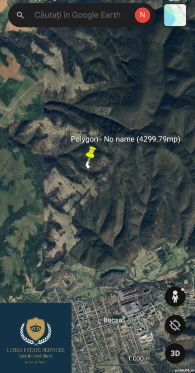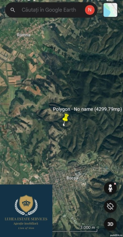 Luhea Estate Services vă propune spre vânzare un teren cu suprafața de 4300 mp. V-ați gândit în ultimul timp că aveți nevoie de un teren arabil, de o grădină retrasă sau de o oază de liniște? Dacă da, vă recomand să alegeți acest teren extravilan din Munții Dognecei la doar 4 km de drumul județean ce trece prin Bocșa. Accesul se face atât cu tractor cât și SUV (4x4) pe un drum de pământ. Terenul a fost lucrat în trecut însă acum este acoperit de vegetație. Ceea ce înseamnă că vă puteți construi o cabană la umbră, printre copaci. Totodată, în apropierea terenului trec stâlpi de înaltă tensiune ceea ce face posibilă o eventuală racordare la curent electric. Terenul are o priveliște minunată ce cuprinde parte din orașul Bocșa iar liniștea este de nedescris. Preț mic... doar 9900 Eur + 2% comision agenție Cât despre oportunități...în calitate de agenție imobiliară vă spunem doar atât: @Primăria Bocșa are în vedere construirea unei centuri ocolitoare a orașului Bocșa chiar în apropierea acestui teren!