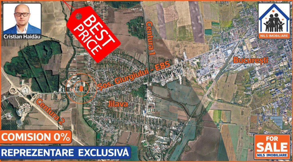 Oportunitate! Doar 90e/mp! / Teren intravilan in Jilava Ilfov, de 4967mp si cu dubla deschidere de cate 40ml. In fata fix la Soseaua Giurgiului - E85 si in spate la un drum paralel cu Sos Giurgiului. / Utilitati: curent, gaze, apa, canalizare! / Traficul intens, expunerea extraordinara, accesibilitatea rutiera optima (deschidere mare la Sos Giurgiului E85 si situarea intre cele doua centuri ale Bucurestiului) il fac ideal pentru toate tipurile de activitati comerciale, servicii, de productie sau logistice! / Puteti vedea si filmare aeriana cu drona pe site-ul NILS Imobiliare. / Comisionul este 0 prin NILS Imobiliare! /
