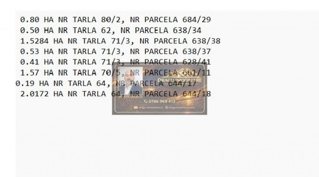 Pentru claritate și transparență, sunt publicate suprafețele exacte, tarlalele și parcelele aferente terenurilor agricole situate în extravilanul comunei Munteni. Terenurile sunt potrivite în special pentru agricultori din zonă, fiind amplasate astfel încât se pot lucra ușor. Deși unele dintre ele au cărți funciare diferite, în practică sunt alăturate sau aflate în imediata apropiere, ceea ce le face oarecum comasate din punct de vedere al exploatării agricole. Suprafațe și identificare cadastrală: 0,80 ha – tarla 80/2, parcela 684/29 0,50 ha – tarla 62, parcela 638/34 1,5284 ha – tarla 71/3, parcela 638/38 0,53 ha – tarla 71/3, parcela 638/37 0,41 ha – tarla 71/3, parcela 628/41 1,57 ha – tarla 70/5, parcela 661/11 0,19 ha – tarla 64, parcela 644/17 2,1072 ha – tarla 64, parcela 644/18 Terenurile sunt agricole, cu randament bun, motiv pentru care sunt prezentate detaliat prin tarla și parcelă, informații relevante pentru cei care cunosc zona și pot evalua corect poziționarea și potențialul agricol. ???? Acte la zi, situație juridică clară. ???? Localizare cunoscută, specifică exploatării agricole din comuna Munteni.
