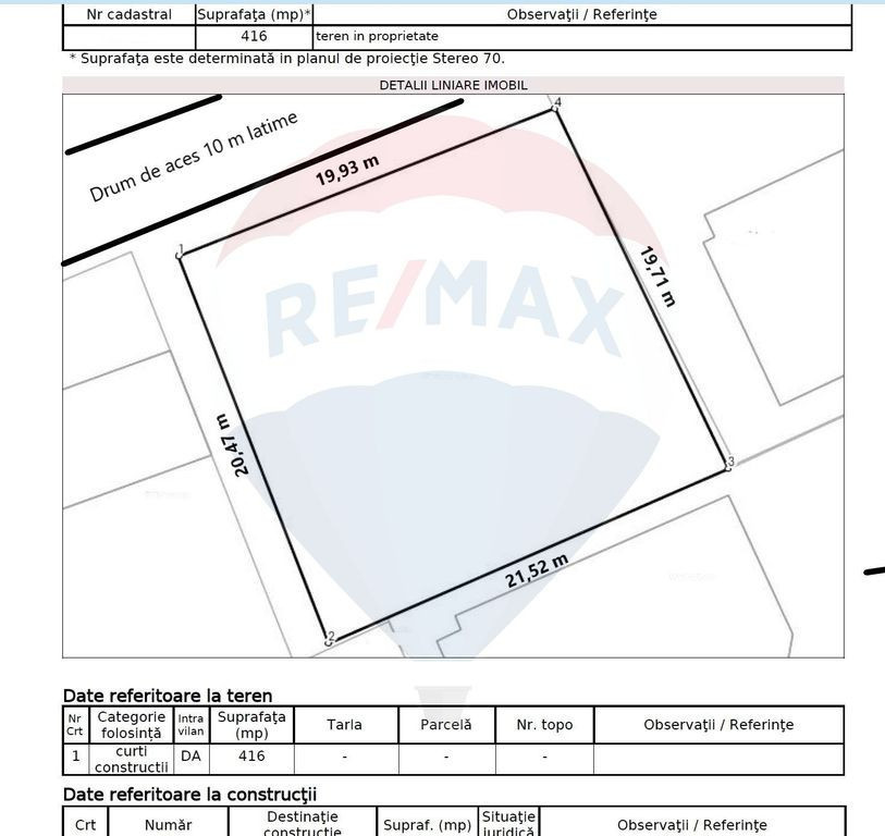Va propunem pentru vanzare un teren intravilan cu o suprafata de 416 mp, din acte, 478 mp din masuratori, front stradal de 19,9 m/ 21,91 m, adancime 20.4 m/22.27m, cu toate utilitatile. Terenul este situat in zona Banasa, Dobrogeanu Gherea. Latimea drumului de acces la proprietate este de 8 m (inclusiv trotuarele). Zona este una exclusivista, in imediata apropiere gasim centre comerciale si lacul Baneasa. Pentru mai multe detalii si vizionari ne puteti contacta telefonic.