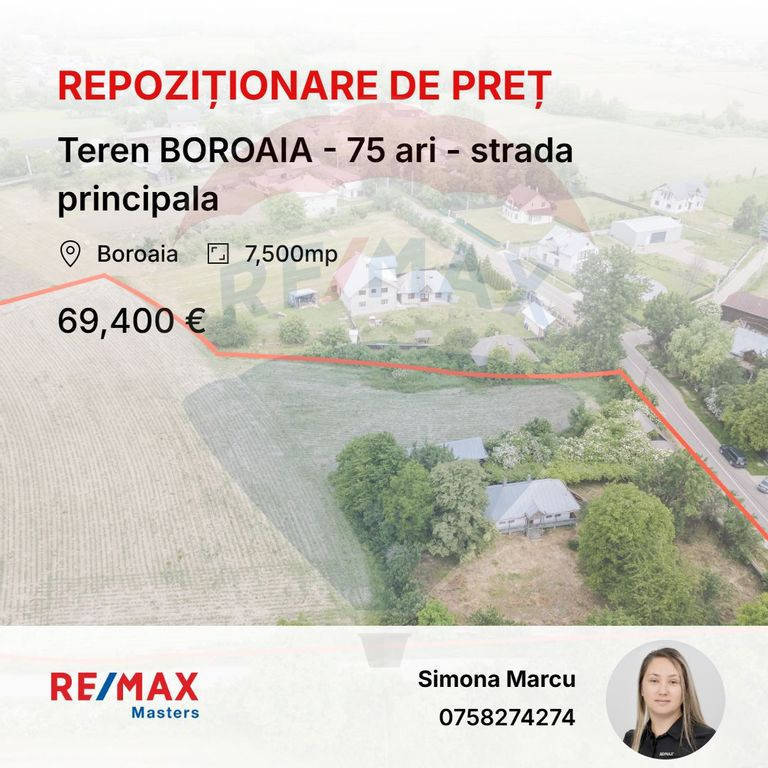 Teren generos de 75 ari cu construcții intabulate – oportunitate ideală pentru dezvoltare! Situat în comuna Boroaia, acest teren oferă o suprafață amplă de 7.500 mp (75 ari), cu deschidere mare și acces facil. Proprietatea include construcții intabulate, ce pot reprezenta baza ideală pentru un proiect nou – fie rezidențial, agricol, turistic sau de altă natură. Poziționat într-o zonă cu potențial, terenul beneficiază de utilități în proximitate și un cadru natural atractiv, ceea ce îl face potrivit atât pentru investiții, cât și pentru construcții în regim propriu. Suprafață: 75 ari Construcții existente intabulate Posibilitate de extindere sau reconversie Acces bun și deschidere generoasă Ideal pentru case, depozite, activitate comercială. Contactează-mă și hai să vezi despre ce este vorba!