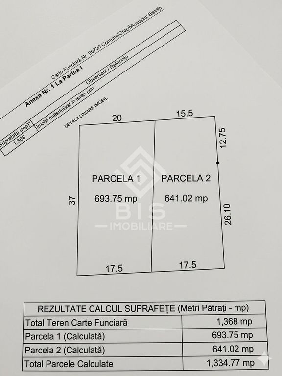 Vând parcelă de teren ideală pentru construcție casă, situată în Sigmir (municipiul Bistrița), într-o zonă rezidențială nouă, liniștită și exclusivistă, populată doar de case moderne. Detalii tehnice (Parcela 1 conform planului): Suprafață: 693,75 mp (din totalul de 1.368 mp). Dimensiuni: Front generos de 17,5 metri liniari. Formă: Dreptunghiulară (17,5m x 37m / 40m), perfectă pentru amplasarea oricărui tip de locuință. Documentație: Extras de Carte Funciară la zi, plan de parcelare (vizibil în poze). Utilități (la limita proprietății - vezi poze): ✅ Gaz (rețeaua trece prin fața terenului). ✅ Curent electric (stâlp și firidă lângă parcelă). ✅ Apă și Canalizare. Locație Premium: Cartier de case noi, departe de zgomot, cu o vedere panoramică superbă spre dealurile Sigmirului. Pentru mai multe detalii sau pentru a programa o vizionare, vă stau la dispoziție!