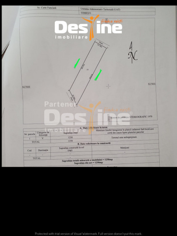 **Destine Imobiliare vă propune spre achiziție un teren de 1250 mp, intravilan, cu deschidere pe capete la doua drumuri.