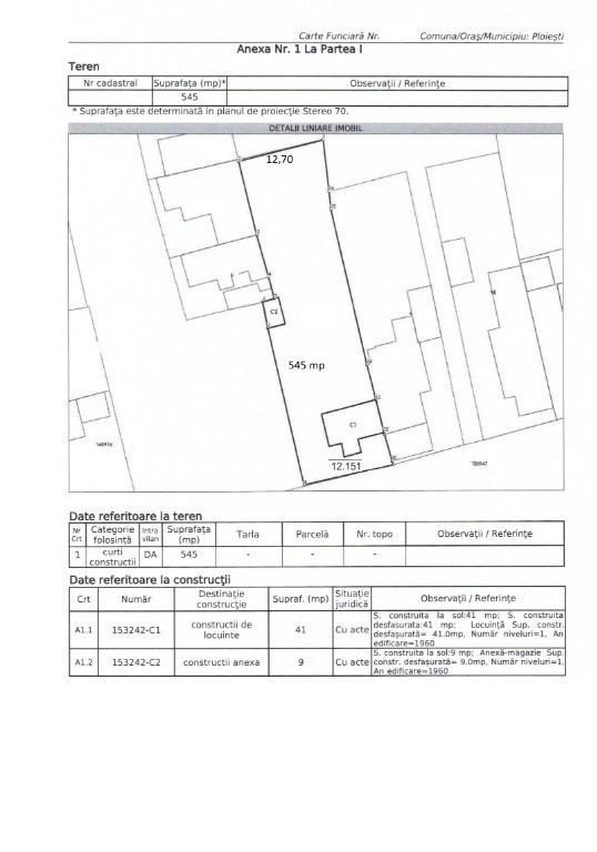 Agenția Imobiliară LOCATO vă propune spre vânzare o proprietate situată în Ploiești, str. Tudor Vladimirescu nr. 58, vis-a-vis de blocul de locuințe DORA . Proprietatea este compusă din: Teren în suprafață de 545 mp, având un front stradal de 12,15 ml; Două construcții cu caracter demolabil, edificate în anul 1960: Corp C1 casă cu suprafața de 41 mp; Anexă în suprafață de 9 mp. Terenul este racordat la utilități (apă, gaz, curent) și se pretează pentru: construirea unei case individuale sau a mai multor unități locative; dezvoltarea unei construcții cu destinație comercială, datorită amplasării excelente. Localizare avantajoasă: proprietatea se află la numai 15 m de stația de transport în comun ce deservește traseele 4 și 35, asigurând acces rapid către principalele zone ale orașului. Preț de vânzare: 129.000 (negociabil) Comision agenție: 2%
