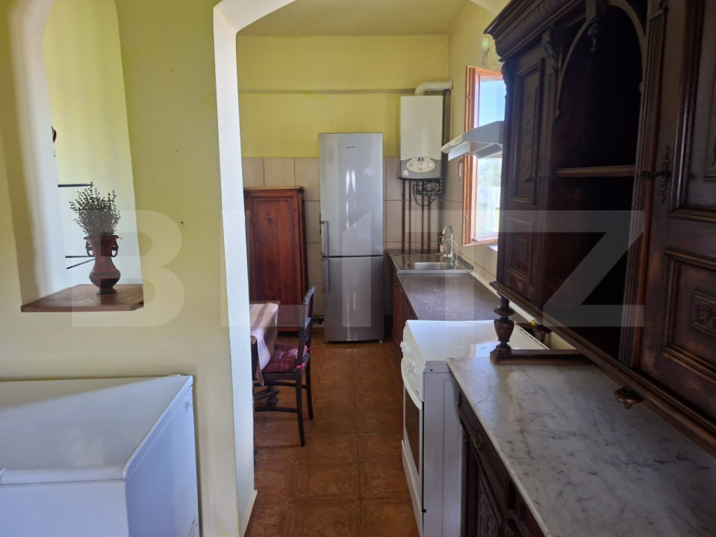 Blitz va propune spre vânzare o casă construită în anul 1970, situată pe un teren generos de 1430 mp, ideală pentru o familie care își dorește spațiu și confort. Proprietatea dispune de o suprafață utilă de 106 mp și beneficiază de o fațadă de 30 metri, oferind acces facil și multiple posibilități de amenajare. Imobilul este compartimentat practic, având 2 dormitoare, 2 băi și o bucătărie spațioasă prevăzută cu cămară. În plus, casa dispune de un garaj, perfect pentru protejarea autoturismului. Locuința este racordată la toate utilitățile necesare: apă, gaz, curent și canalizare, asigurând astfel confortul zilnic. De asemenea, proprietatea beneficiază de 2 fântâni (puțuri), oferind o sursă suplimentară de apă. Casa este dotată cu geamuri termopan și acoperiș nou din tablă Lindab, ceea ce contribuie la eficiența energetică și durabilitatea construcției. Această proprietate reprezintă o oportunitate excelentă pentru cei care caută o casă cu teren mare, într-o zonă liniștită. Cod ofertă / ID BLITZ: P170678 Id intern: P170678