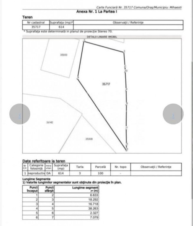 Vă prezentăm un teren cu potențial ridicat, perfect amplasat în comuna Mihăești, pe strada Gurișoara, județul Vâlcea. Proprietatea beneficiază de deschidere directă la drumul principal (DN67), un avantaj major atât pentru accesibilitate, cât și pentru vizibilitate. Zona este în continuă dezvoltare și oferă un echilibru ideal între liniște și acces rapid către localitățile din apropiere: Băile Govora, Ocnele Mari și municipiul Râmnicu Vâlcea. Caracteristici teren: • Suprafață totală: 614 mp • Front stradal: 44 m • Dimensiuni: lățime 18 m, lungime 38 m • Acces direct: DN67 – drum asfaltat • Topografie: plană, formă regulată – ideală pentru proiectare și construcție • Utilități: curent trifazic montat deja pe teren Terenul este potrivit pentru: • construcția unei locuințe permanente, • realizarea unei case de vacanță, • dezvoltarea unei investiții rezidențiale sau comerciale de mici dimensiuni, datorită amplasării excelente la drumul național și a accesului foarte facil. Proprietatea oferă oportunitatea perfectă pentru cei care caută un teren pregătit pentru construcție într-o zonă cu dezvoltare continuă și conexiuni rapide către puncte de interes importante. Dacă sunteți interesați sau doriți mai multe informații, vă rugăm să ne contactați. Suntem aici pentru a vă oferi toate detaliile și pentru a programa o vizionare. Id intern: P4309