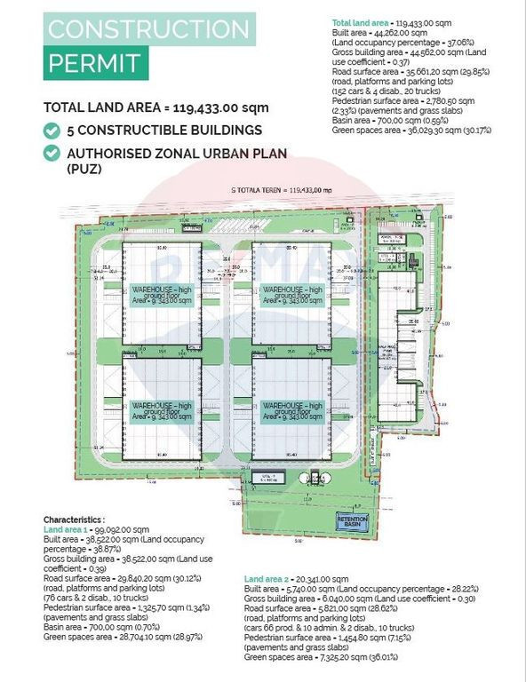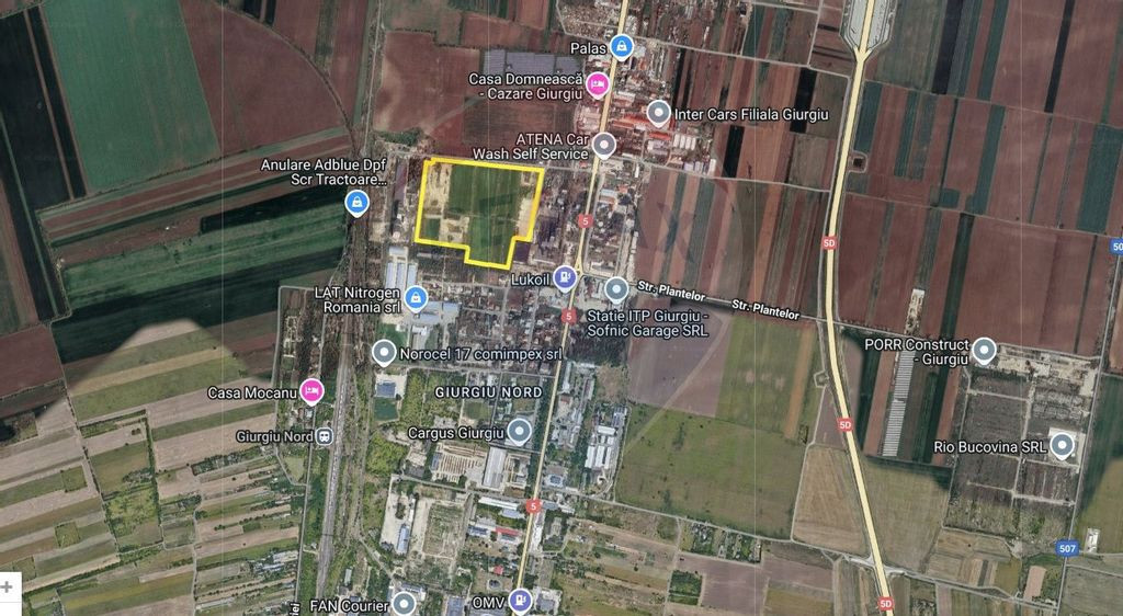 Teren de vânzare cu PUZ aprobat – 119.433 mp | Giurgiu Nord – Destinație logistică, industrială și servicii Reglementare urbanistică (PUZ aprobat): Parc de activități cu funcțiuni logistice și de producție Zonificare funcțională conform PUZ:, terenul este împărțit în două unități teritoriale (UTR) distincte: 1. I1 – Subzonă de producție și depozitare Suprafață alocată: 45.202 mp POT max.: 50% CUT max. (volumetric): 10 mc/mp Regim maxim înălțime (RH): 20 m Funcțiuni: hale de producție, platforme de manevră, clădiri administrative și sociale 2. I1a – Subzonă de comerț, servicii și logistică Suprafață alocată: 74.231 mp POT max.: 50% CUT max. (volumetric): 10 mc/mp Regim maxim înălțime (RH): 20 m Funcțiuni: hale logistice, spații de comerț și servicii, platforme, parcări, spații verzi Construcții propuse conform PUZ – exemplu de implementare: Zona I1: HALA DEPOZITARE 6624 MP, Hmax = 20m Căi de acces auto & platforme de manevră: lățime 7 m + spații de întoarcere Zona I1a: 4 hale logistice identice, cu suprafață individuală: 9.343 mp/hala, TOTAL: 37372 MP Regim: parter înalt – H = 15 m Funcțiune: cross-docking (24 rampe/hala + 2 accese TIR interior) Structură: prefabricate 12x24 m – fără stâlpi intermediari Posibilitate amenajare mezanine ???? Bilanț teritorial (exemplu de amenajare): Suprafață construită totală: 44562mp Suprafață circulații rutiere/platforme/parcări: 38860mp Parcări: 76 autoturisme + 2 pentru persoane cu dizabilități + 10 TIR Suprafață pietonală: 2781 mp Spații verzi amenajate: 38.830 mp (≥30%) Bazin retenție ape pluviale: 700 mp ???? Utilități & infrastructură Acces direct din DN5 (București – Giurgiu) prin Str. Molidului (profil 12 m propus) Infrastructură rutieră modernizabilă (acces principal și secundar – viitor sens giratoriu) Rețele existente / în curs de extindere: Energie electrică Gaze naturale (PE 40 mm) Apă și canalizare (conform aviz Apa Service) ???? Localizare strategică – avantaj major pentru logistică 45 min de București, 15 min de Ruse (Bulgaria) Acces la noduri de transport multimodal: - DN5, DN5B, DN5C, DN5D - Cale ferată existentă în proximitate (fără influență directă) - Port la Dunăre, acces către Austria – Germania – Marea Neagră - Aeroport Otopeni – 60 km ✅ Puncte forte pentru investitori și dezvoltatori: - PUZ aprobat pentru dezvoltare imediată - Zonificare optimă pentru logistică, producție, depozitare, servicii - Structură de proprietate clară – CF individual - Ideal pentru parc logistic, centru de distribuție, producție ușoară sau heavy duty