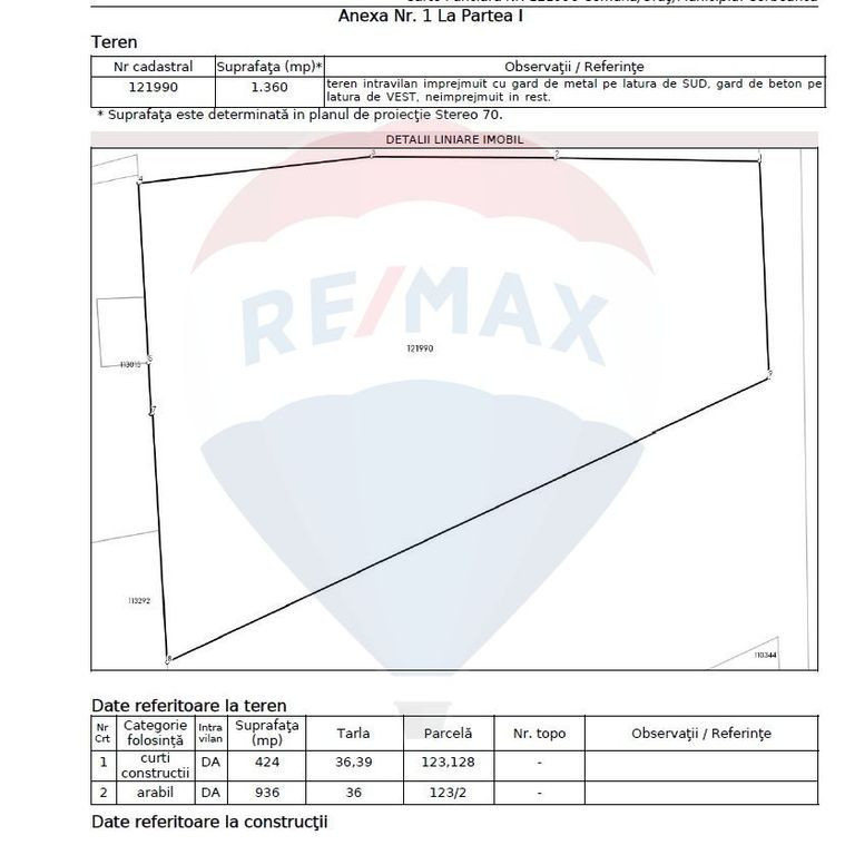 Teren de vânzare – Corbeanca, lângă intrarea în cartierul Paradisul Verde Oportunitate excelentă de investiție! Vă propunem spre vânzare un teren foarte bine amplasat în Corbeanca, exact lângă intrarea în cartierul Paradisul Verde, cu acces direct la drumul principal. Terenul are o suprafață de 1.360 mp și beneficiază de o deschidere la strada principală de 17 ml, cu o adâncime de aproximativ 52 ml. Poziționarea sa strategică îl face ideal atât pentru construirea unei locuințe, cât și pentru dezvoltarea unui mic proiect imobiliar rezidențial sau comercial. Avantaje: - amplasare excelentă, într-o zonă în plină dezvoltare - acces direct din drumul principal - toate utilitățile în imediata apropiere potrivit pentru investiție sau dezvoltare Date cadastrale: nr. cadastral 121990. Pentru mai multe detalii sau pentru stabilirea unei vizionări, vă rog să mă contactați.