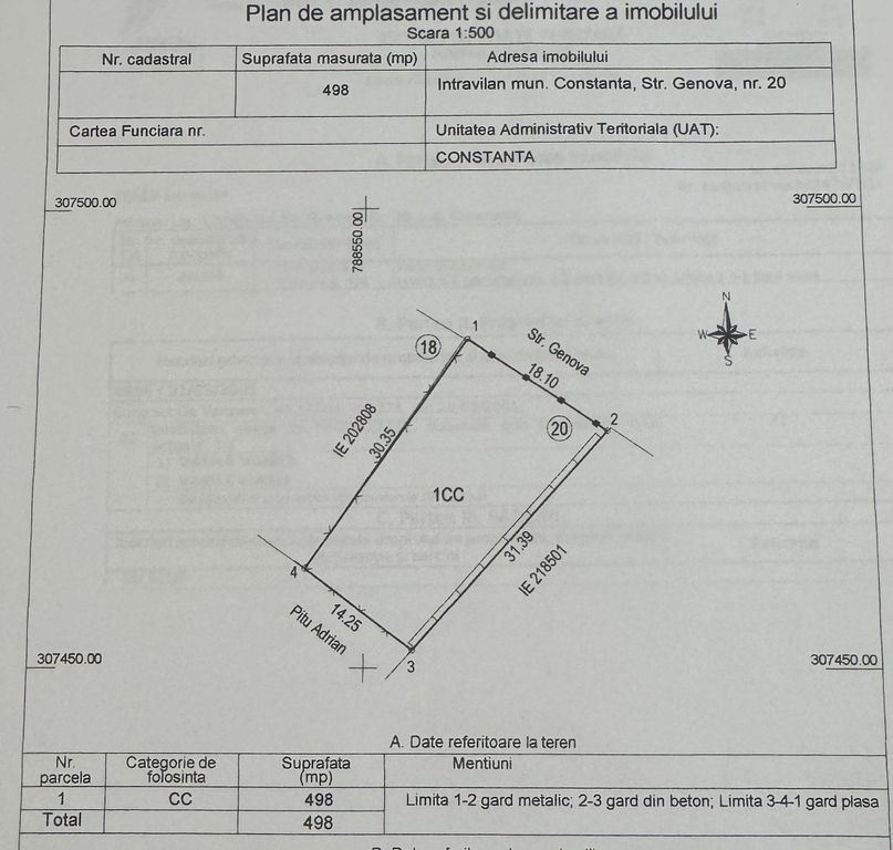 Agenția Acord Imobiliar vă oferă spre vânzare un teren intravilan situat în municipiul Constanța, zona Dedeman – Ferma Agrozootehnică, pe strada Genova nr. 20, ideal pentru investiție pe termen mediu-lung. Caracteristici teren: • Suprafață totală: 498 mp (conform măsurătorilor) • Regim de înălțime admis: P+2E (conform Certificatului de Urbanism) • Categoria de folosință actuală: Curți-construcții • Regim economic: Zonă locuințe individuale și colective mici (ZRL2c) • Procent de ocupare a terenului (POT): max 45% • Coeficient de utilizare a terenului (CUT): max 1,0 • Acces direct la drum public (Str. Genova) Utilități disponibile PE TEREN: • Gaz • Curent electric • Apă și canalizare IMPORTANT DE ȘTIUT: Terenul se află în prezent sub regim de interdicție temporară de construire, fiind necesară definitivarea echipării edilitare în zonă, conform Certificatului de Urbanism nr. 159 din 22.04.2025. De asemenea, orice investiție viitoare în construcții necesită aprobare PUZ și reglementări aferente. Acest aspect face terenul ideal pentru: • Investitori care doresc să achiziționeze la un preț competitiv în vederea valorificării ulterioare • Portofolii imobiliare orientate spre speculație și creșterea valorii terenului în timp • Proiecte de dezvoltare ce pot fi demarate după actualizarea documentațiilor urbanistice Documentație completă: • Certificat de Urbanism actualizat (valabil până la 22.04.2026) • Extras de carte funciară la zi • Planuri de încadrare în zonă Pentru mai multe detalii, nu ezitați să ne contactați!