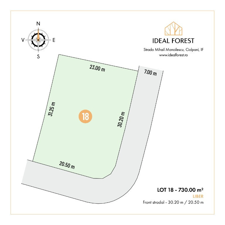 Vă oferim o oportunitate unică de investiție pe un teren situat în Izvorani,cu deschidere la padurea Snagov, avand o suprafață totala de 21774mp. Este parcelat in 35 de loturi.Loturile au suprafete cuprinse intre 407 si 730mp, avand destinatia de teren curti constructii. Preturile loturilor pornesc de la 17210 euro plus tva. Oferim spre vanzare lot nr. 18, in suprafata totala de 730mp la pretul promotional de 50200euro +tva. Pretul include canalizare si apa, lucrari efectuate la fiecare parcela doar in incinta complexului, pana la poarta si drumul la nivel de piatra concasata. Acest teren are un potențial extraordinar, oferind posibilitatea unor constructii intr-o zona linistita,in continua dezvoltare, in jur aflandu-se la momentul actual si alte proprietati. Toate utilitatile la strada principala (curent,gaze, canalizare ) făcând din acesta o alegere excelentă pentru viitoarea dvs. locuință Cu o locație excelentă , este pregătit pentru a deveni baza unei investiții de succes. Pentru vizionari, oferte si alte detalii, puteti accesa site-ul .idealforest.ro sau telefonic la nr. nu ezitati sa ne contactati.