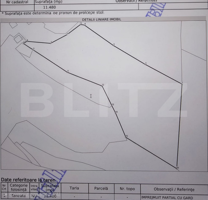 ???? BLITZ oferă spre vânzare teren extravilan cu posibilitate de trecere în intravilan, în suprafață de 11.480 mp, situat în localitatea Trâncești, comuna Scărișoara. Amplasat la altitudine, terenul beneficiază de o priveliște panoramică spectaculoasă asupra zonei montane, fiind ideal atât pentru investiție, cât și pentru dezvoltare. ✨ Oportunitate excelentă într-o zonă deosebită de munte! ???? Caracteristici principale: ???? Suprafață totală: 11.480 mp ???? Deschidere la drum: aprox. 100 ml ????️ Acces rutier: drum parțial asfaltat + drum de pădure ⚡ Curent electric disponibil la limita proprietății ???? Avantaje: ???? Zonă liniștită și retrasă ????️ Priveliști montane deosebite ???? Potențial ridicat de dezvoltare ???? Ideal pentru cei care își doresc o proprietate într-un cadru natural autentic, perfectă pentru relaxare, casă de vacanță sau investiție. ???? Pentru mai multe detalii sau programarea unei vizionări, nu ezitați să mă contactați! Cod ofertă / ID BLITZ: P168715 Id intern: P168715