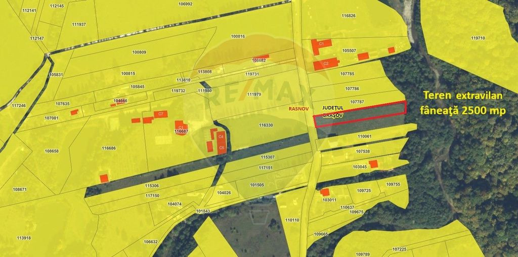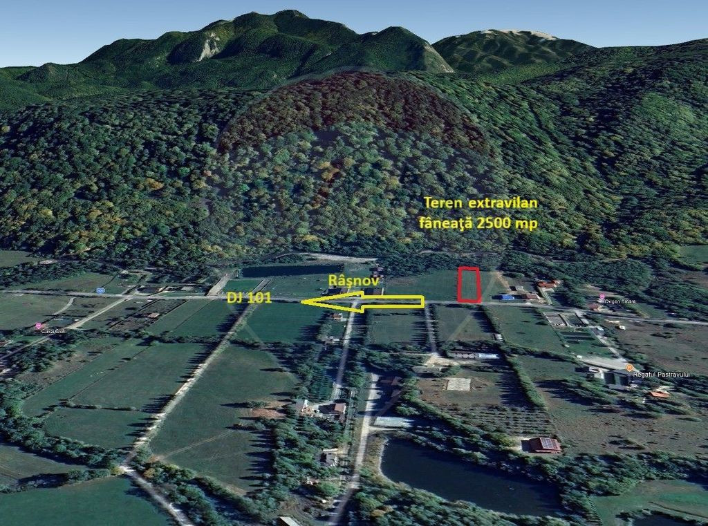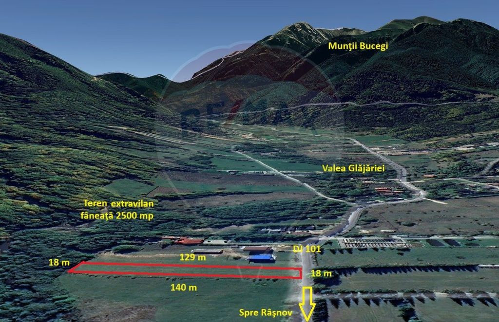 Vă propunem spre vânzare, în regim de reprezentare exclusivă, cu comision 0% din partea cumpărătorului: Teren extravilan, fâneaţă, 2500 mp, front 18 m, adâncime 140 m. Curentul este la teren. Zona Glăjărie este una dintre cele mai căutate zone pentru turism montan și locuințe de vacanță. Accesul se face din DJ 101, asfaltat, la doar câteva minute de centrul orașului Râșnov și la 15 km de Bran sau Poiana Brașov. Panorama este superbă către Munții Bucegi și Piatra Craiului. Zonă ideală pentru construcția de case de vacanță, cabane turistice, investiții în regim hotelier (Airbnb, booking). Vă mulțumim și vă stăm la dispoziție cu detalii suplimentare despre acest teren.