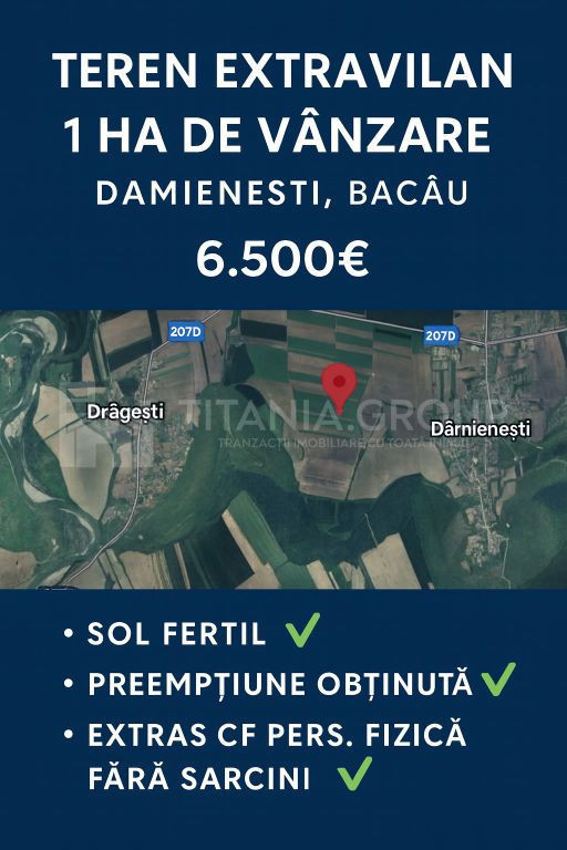 Se oferă spre vânzare un teren extravilan cu suprafața de 1 hectar, situat în zona de sud a parcelei „23 August”, la doar 90 m distanță de râul Râpaș – zonă agricolă liniștită și cu sol fertil, perfectă pentru culturile de legume, cereale sau plante tehnice. ???? Caracteristici teren: • Suprafață: 1 ha • Categoria de folosință: arabil • Drum de acces: drum de pământ • Relief drept, sol bun pentru agricultură • Locație: zona de sud a parcelei 23 August, Damienești ???? Situație juridică: • Preempțiune obținută – vânzare se poate face imediat • Extras CF persoană fizică, fără sarcini ???? Preț: 6.500 € Comision 0 cumpărător Pentru mai Multe detalii: 0790489799