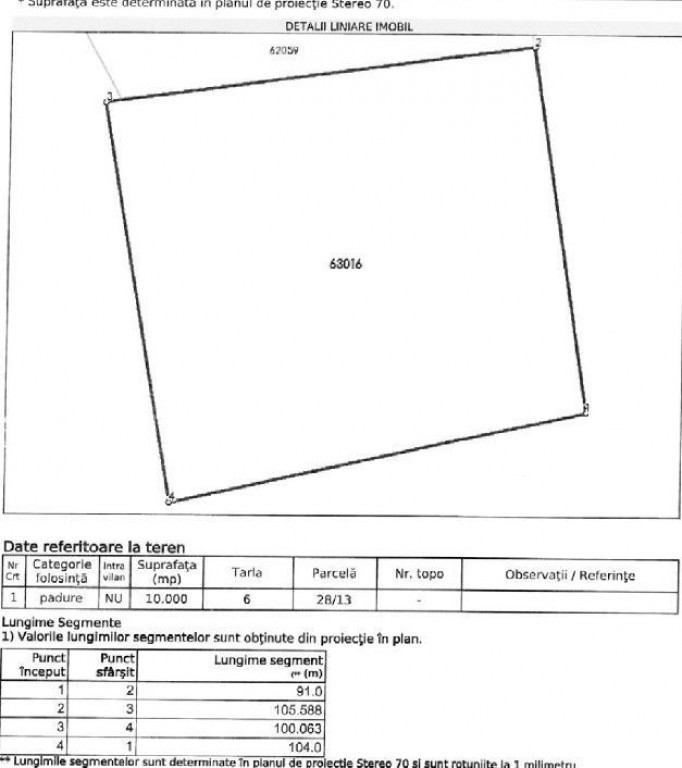 Licitatie publica teren cota parte de 1/48 din dreptul de proprietate. Teren extravilan in suprafata totala de 10.000 mp, categorie de folosinta padure, situat in sat Horgesti, com. Horgesti, jud. Bacau – tarlaua nr. 6, parcela nr. 28/13. are o forma patrata, topografie plana, nu este expus la riscuri de alunecari de teren sau inundatii. Proprietatile imobiliarae evaluate, nu dispun de electricitate, acestea fiind cu destinatie padure (categorie de folosinta padure), accesul la propietati facandu-se de pe un drum neamenajat. Deschidere de aproximativ 90 ml