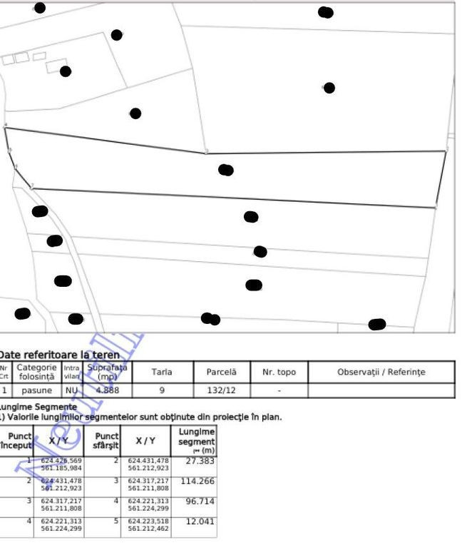 Licitatie publica teren Comuna Ardeoani, judetul Bacau Teren extravilan neimprejmuit avand categoria de folosinta pasune, T9, P132/12 Suprafata teren: 4888 mp Tip drum de acces: strada asfaltata/pamant Vecinatati: terenuri extravilane, cabane de vacanta, case. Utilitati: energie electrica in zona Deschidere app 27 ml