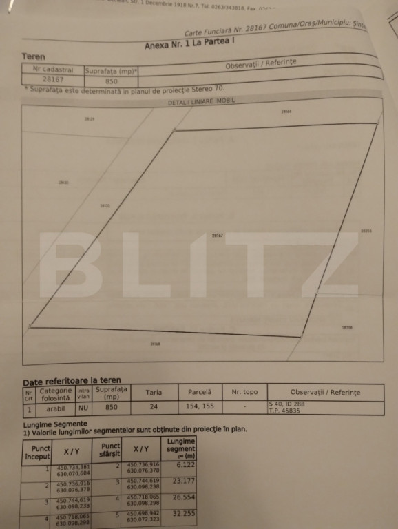 BLITZ va propune spre vanzare un teren extravilan in suprafata de 850 mp respectiv 8,5 ari, situat în comuna Blăjeni de Jos, la limita cu intravilanul. Terenul este drept, cu acces facil, ideal pentru construcție cabană sau casă de vacanță într-o zonă liniștită și pitorească. Acte în regulă: extras CF și schiță cadastrală actualizată Zonă în dezvoltare, aproape de natură și drumuri de acces Poziție excelentă – la marginea intravilanului, cu posibilitate viitoare de extindere a utilităților. Pentru detali suplimentare sau vizionarea ofertei,nu ezitati sa ne contactati!! Cod ofertă / ID BLITZ: P150080 Id intern: P150080