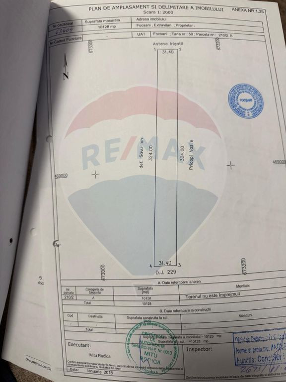 Va propun spre vanzare un teren extravilan in suprafata totala de 10.128mp. Acesta este situat pe raza municipiului Focsani zona Onasis, pe drumul judetean 204D ( Soseaua Suraii ) si beneficiaza de un front stradal de 31.4m la strada. Pentru mai multe detalii ma puteti contacta.