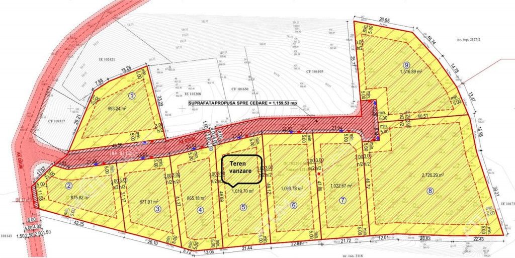 Va propun spre vanzare un teren intravilan cu o suprafata generoasa de 1019 mp, situat in localitatea Tocile, una dintre cele mai cautate locatii pentru dezvoltarea de case de vacanta si pensiuni turistice. Proprietatea este parte dintr-un ansamblu de 9 parcele, toate avand deschidere la acelasi drum de acces privat cu latimea de 8 metri, drum prevazut in documentatia PUZ aferenta zonei. Zona se remarca prin liniste, peisaje naturale si un cadru ideal pentru cei care isi doresc o locuinta intr-un mediu curat, aerisit si neaglomerat, dar totodata aflat la doar cateva minute de municipiul Sibiu. Conform Regulamentului Local de Urbanism aferent PUZ-ului se pot realiza constructii cu functiuni turistice si de recreere, precum case de vacanta, pensiuni, bungalow-uri si anexe aferente acestora, cu respectarea urmatorilor indici urbanistici si conditii tehnice: Regim de inaltime admis: P E (inaltime maxima la coama 11 m, streasina 7 m) POT maxim: 35% CUT maxim: 0.7 Retrageri fata de limite: minim 5ndash;7 m la strada, minim 3 m lateral/spate Suprafata minima a unei parcele construibile: 350 mp Utilizari admise: case de vacanta, pensiuni turistice, bungalow-uri, servicii turistice, anexe Obligativitatea amenajarii de spatii verzi minime: 30% din teren Toate locurile de parcare trebuie realizate pe parcela proprie Drumul de acces este inclus in proiectul de dezmembrare, are 8 metri latime si urmeaza sa fie notat in cartea funciara ca drum cu servitute de trecere pentru toate parcelele din ansamblu, conform cerintelor urbanistice. Utilitatile se afla la aproximativ 200 de metri de teren, putand fi extinse in mod organizat si eficient, fie individual, fie prin asociere cu ceilalti proprietari din zona. Documentatia urbanistica mentioneaza racordarea la reteaua electrica si de apa-canal existenta. Terenul are o forma regulata, este bine proportionat si ofera posibilitatea configurarii optime a unei constructii, beneficiind de o deschidere generoasa si de o pozitionare excelenta fata de drum. Zona este in plina dezvoltare, cu potential mare atat pentru investitii turistice, cat si pentru constructia unei locuinte permanente intr-o zona retrasa si ferita de trafic. Valoarea terenului est de 66.000 euro, negociabil.