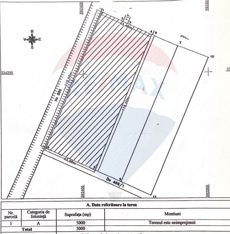 Se poate vinde integral (10.600 m²) sau doar parcela de 5.600 m² neafectată de restricții