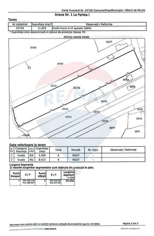O oportunitate de investiție într-o zonă în plină dezvoltare! Vă propunem spre vânzare un teren intravilan generos, cu o suprafață totală de 11.622 mp, situat pe Strada Cismari, în orașul Vălenii de Munte, județul Prahova – una dintre cele mai pitorești și căutate zone din regiune. Localizare strategică: la doar 32 km de Ploiești (DN1A) și 75 km de Brașov, cu legătură directă la calea ferată (gară locală) și DN1A. Amplasare excelentă pentru legături cu marile orașe și viitoarea autostradă Ploiești–Comarnic Suprafață totală: 11.622 mp Teren plat: aproximativ 8.000 mp – ideal pentru construcții imediate, fara a fi nevoie de lucrari de amenajare a terenului. Teren în pantă: aproximativ 3.500 mp – perfect pentru amenajări recreative, terase, grădini sau spații de relaxare Posibilitate parcelare: terenul poate fi împărțit si în două loturi distincte Utilități la stradă: gaze naturale, apă, canalizare și electricitate Utilități disponibile: rețea de gaze, apă, canalizare (85 % acoperire la nivel local), energie electrică și canalizare finalizată în zonă în 2010 . Acces facil: situat aproape de drumurile principale ale orașului Mediu și turism Climă și peisaj: amplasat în depresiunea Vălenii de Munte, cu altitudinea de aproximativ 350 m și aer de munte ozonat, ideal pentru recreere și turism . Obiective turistice în zonă: Muzeul memorial „Nicolae Iorga” și Muzeul de etnografie a Văii Teleajenului Biserici vechi monument istoric (ex. Sf. Spiridon din Berevoiești) și Moara Domnească din Drajna Ruine romane la Drajna (castrul roman) Proximitate față de Parcul Natural Bucegi – potențial pentru activități outdoor Planuri de dezvoltare: orașul se axează pe extinderea infrastructurii, dezvoltarea turismului și servicii industriale ușoare/servicii . Propuneri de utilizare Pensiune, retreat, stațiune mică – zonele în pantă pot fi transformate în terase, grădini sau spații de relaxare. Complex rezidențial și/sau agro-touristic – combinație de case, spații verzi și activități turistice (plimbări, drumeții). Investiție mixtă: spații de locuire + activități comerciale ușoare sau recreative. Recomandări finale Parcelare inteligentă: Partea plată (8.000 mp) pentru clădiri, Partea în pantă (~3.500 mp) pentru amenajări complementare (spații verzi, zone de relaxare etc.). Beneficii pe termen lung – zonă turistică emergentă, potențial valoros, acces la păduri și munte, climat plăcut. Vălenii de Munte este recunoscut pentru aerul curat, peisajele montane spectaculoase și atmosfera liniștită. Poziționare excelentă: aproape de orașe mari precum Ploiești sau Brașov. Zonă în continuă dezvoltare, cu potențial turistic și rezidențial în creștere. Această proprietate oferă combinația ideală între natură, accesibilitate și potențial de dezvoltare. Indiferent dacă ești investitor sau visezi să construiești un loc special pentru familie, acest teren merită toată atenția ta. Contactează-ne pentru mai multe detalii sau o vizionare!