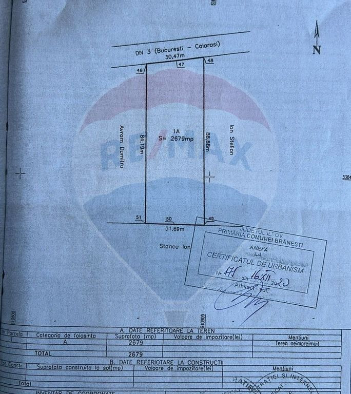 Oportunitate excelenta de investitie: teren intravilan in suprafata de 2.679 mp, situat in comuna Branesti, sat Islaz, cu deschidere generoasa de 30,47 ml la DN3 (Bucuresti – Calarasi). Localizare si acces Amplasare strategica, cu acces direct din DN3 Zona in dezvoltare, cu locuinte individuale construite in proximitate Acces facil catre Bucuresti Vizibilitate foarte buna – ideal pentru investitie pe termen mediu si lung Caracteristici teren Suprafata: 2.679 mp Deschidere la DN3: 30,47 ml Adancime teren: aproximativ 84–88 ml Teren liber de constructii Categoria actuala: arabil (in intravilan) Destinatie de perspectiva: curti constructii Regim urbanistic (conform Certificat de Urbanism) Situat in UTR Li2 – subzona locuintelor individuale Regim de inaltime: P+2 POT maxim: 35% CUT: 1.05 Inaltime maxima: 10 m la cornisa / 15 m la coama Retragere minima fata de DN3: 10 m (conform reglementarilor) Terenul este traversat de conducta de distributie gaze (Transgaz). Construirea se poate realiza cu respectarea retragerilor si obtinerea avizelor necesare. Potential Dezvoltare rezidentiala – locuinte individuale Investitie pentru parcelare Posibila utilizare mixta (in functie de avize), datorita pozitionarii la drum national