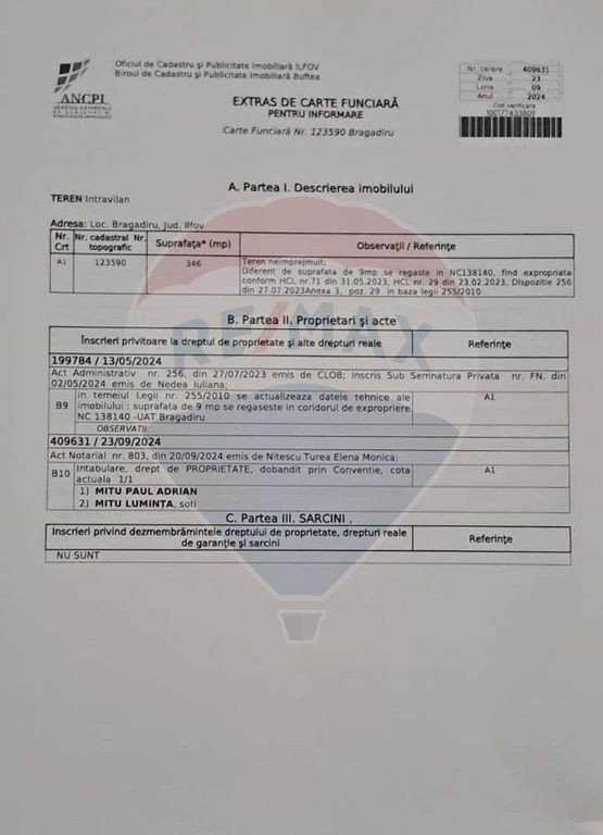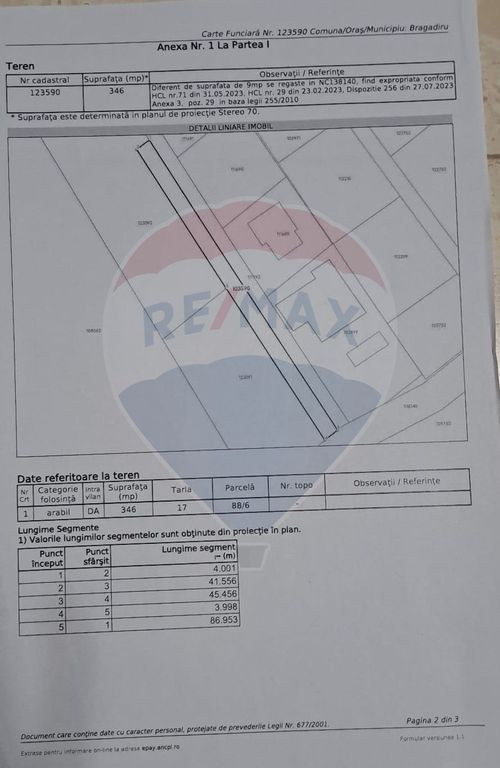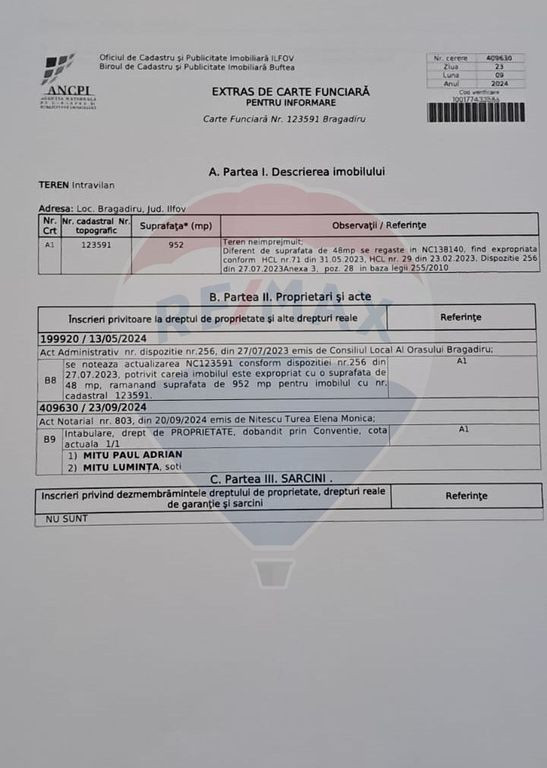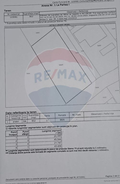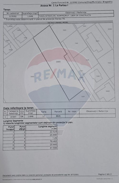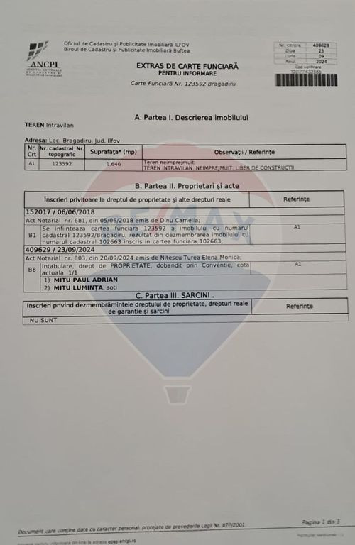 Ne face placere sa va prezentam un teren intravilan de 2944mp cu o deschidere generoasa de 25.73m(compus din 3 terenuri alipite) in zona Rubinului/Bragadiru. Asa cum este mentionat mai sus, terenul de 2944 este impartit in 3 terenuri alipite: 1)Teren intravilan 346mp (numar cadastral 123590) 1)Teren intravilan 952mp (numar cadastral 123591) 2)Teren intravilan 1646mp(numar cadastral 123592) Caracteristici teren: -> Procent de ocupare al terenului(POT):45% -> Coeficient de utilizare al terenului(CUT): 3 -> Regim de inaltime: P+2+M In pozele din anunt puteti gasi extrasele de carte funciara, impreuna cu schita fiecarui segment de teren. Este perfect pretabil investitional pentru realizarea unui residence. Terenul este racordat la toate utilitatile. IMPORTANT: Prin existenta unei deschideri de 25.73m la strada si datorita faptului ca exista un drum de servitute cu o deschidere de 4m, dumneavoastra beneficiati de o deschidere de 21.73m IMPORTANT: Terenul(compus din cele 3) se vinde integral, nu se poate achizitiona doar o singura bucata de teren. Strada Rubinului este in continua dezvoltare, cat de curand strada urmeaza sa fie asfaltata, zona fiind perfect pretabila pentru dezvoltare imobiliara. In proximitate, la doar 700 de metri de teren, exista statia de autobuz "Rubinului" care face legatura cu linia lui 485. In eventualitatea in care doriti sa achizitionati acest teren utilizand un credit ipotecar, va putem oferi solutii inteligente de finantare(fiind in colaborare cu brokeri de credite profesionisti). Comision cumparator: 0% Daca v-am starnit interesul cu acest teren, nu ezitati sa ne contactati pentru a stabili o vizionare!