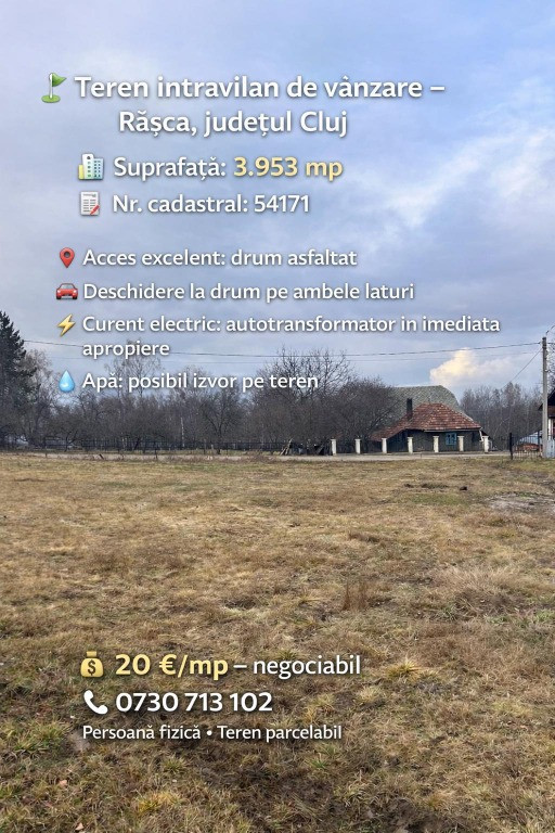 ⛳️Teren intravilan 3.953 mp – Râșca, Cluj ???? Drum asfaltat ???? Drum pe ambele laturi ⚡ Autotransformator lângă teren ???? Posibil izvor ???? Orientare Vest–Est ???? NC 54171 ???? Preț: 20 €/mp – negociabil ???? Tel: 0730 713 102