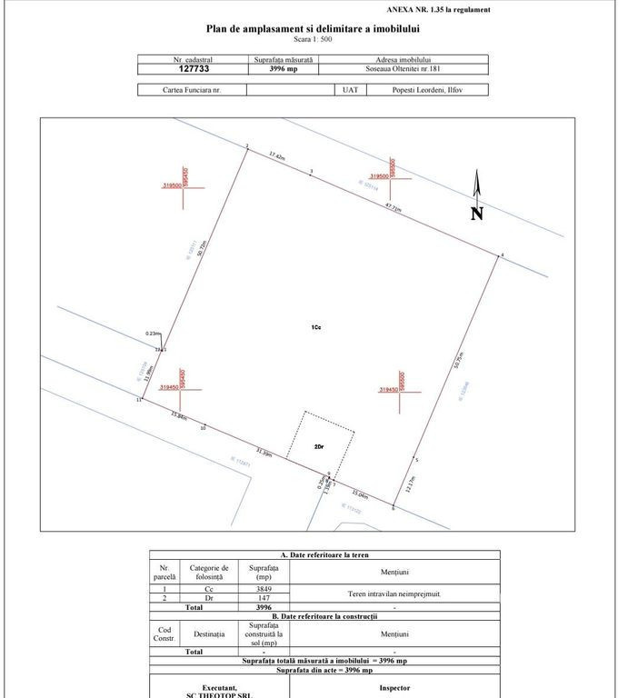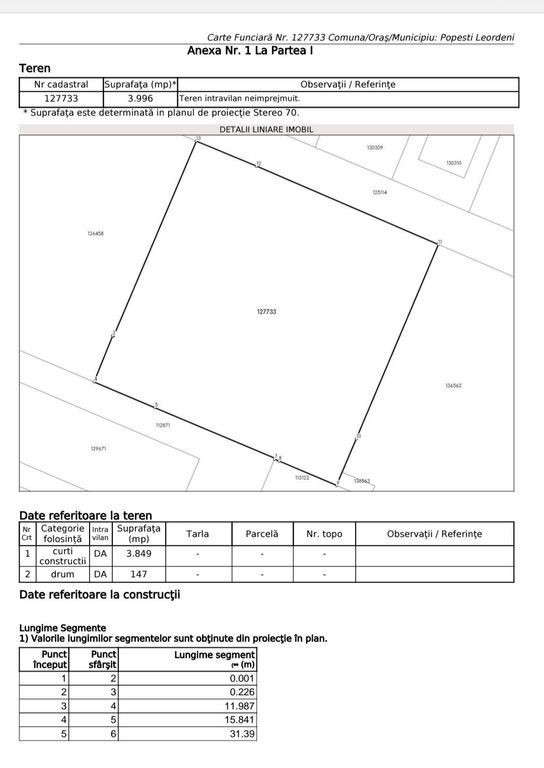 Va propunem spre achizitie un teren intravilan cu destinatia curti-constructii avand suprafata de 3996 mp aflat pe sos. Oltenitei in incinta fostei fabrici Danubiana din Popesti Leordeni. Terenul este cu acces stradal din doua laturi si are forma aproape patrata cu laturile de 65,13 metri, 63,71 metri, 62,94 metri si 62,92 metri. Pret: 600.000 euro + TVA