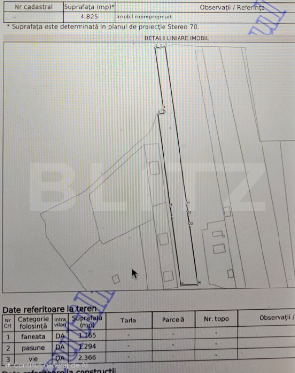 Blitz vă propune o oportunitate excelentă pentru dezvoltare rezidențială! Teren intravilan cu suprafață de 4.825 mp, ideal pentru construirea de case individuale. ✔️ Deschidere generoasă la drum – acces facil și parcelare eficientă ✔️ Deschidere în spate către pădure – liniște, intimitate și cadru natural deosebit ✔️ Utilități disponibile: apă și curent ✔️ Zonă potrivită pentru proiecte rezidențiale Terenul oferă combinația perfectă între accesibilitate și natură, fiind potrivit pentru un mic ansamblu de locuințe. Cod ofertă / ID BLITZ: P164654 Id intern: P164654