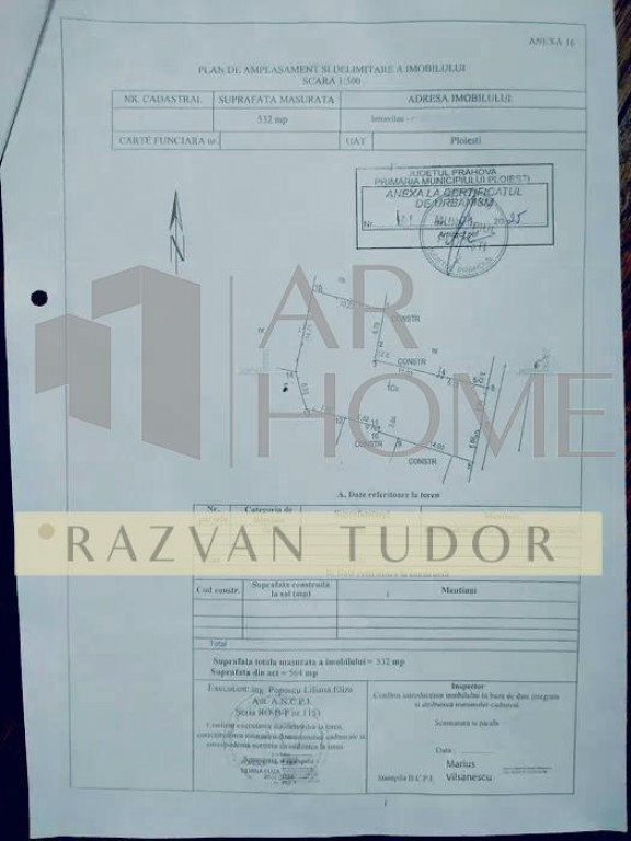 Vanzare teren intravilan in Ploiesti , zona ultracentral. Terenul este pretabil atat pentru locuinta cat si pentru constructia unui bloc tip boutique. Are ca vecinitati Palatul de Justitie , parcul Mihai Viteazu , halele centrale , mijloace de transport in comun , scoala 14. Terenul se afla pe o strada fara trafic auto intens , are o suprafata de 532m2 , deschidere stradala de 13.49ml , POT 50% , CUT 1,5 si regimul de inaltime S P 2-4. Utilitati : apa , lumina , gaz , canalizare Pret : 154 900 Eur , 290 Eur/m2