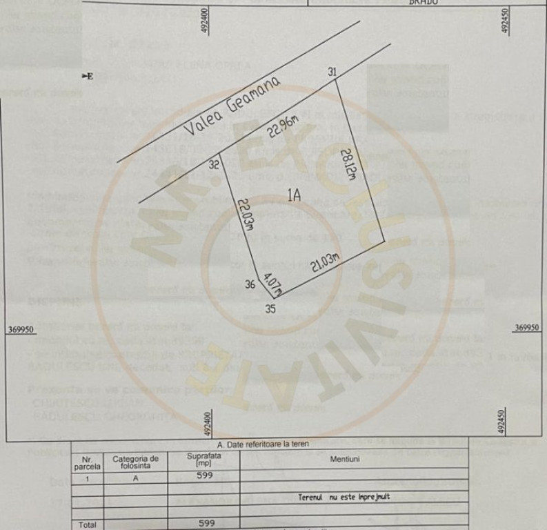 Teren intravilan - Strada Valea Geamana, Pitesti – zona excelenta, toate utilitatile! Va propunem spre vanzare un teren intravilan situat pe strada Valea Geamana, intr-o zona de case noi, linistita si bine conectata. * Suprafata: 599 mp * Front stradal: 22,96 m * Utilitati: apa, gaze, curent electric, canalizare * Acces: drum asfaltat si mijloace de transport in comun la cateva minute de mers pe jos Locatia ofera acces rapid catre oras, dar si catre autostrada A1 Bucuresti–Pitesti, fiind ideala atat pentru constructia unei locuinte, cat si pentru investitie. In apropiere se gasesc magazine, scoli si alte facilitati care asigura confortul zilnic. Un teren cu potential excelent, intr-o zona in plina dezvoltare! * Va asteptam la vizionare pentru a descoperi toate avantajele acestei proprietati! Id intern: P7514